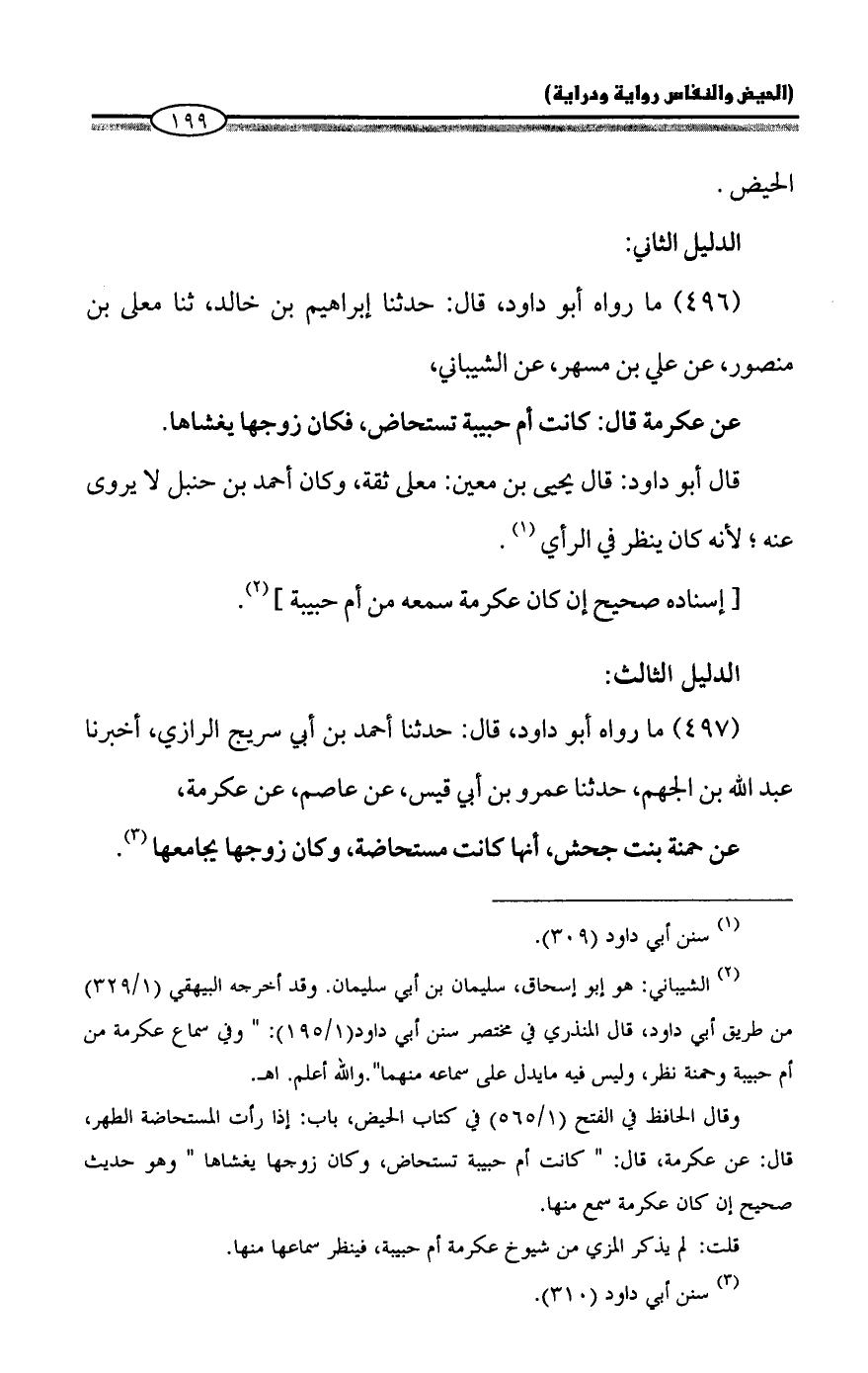 (¬٢) الشيباني: هو أبو إسحاق، سليمان بن أبي سليمان. وقد أخرجه البيهقي (١/ ٣٢٩) من طريق أبي داود، قال المنذري في مختصر سنن أبي داود (١/ ١٩٥): "وفي سماع عكرمة من أم حبيبة وحمنة نظر، وليس فيه ما يدل على سماعه منهما". والله أعلم. اهـ.