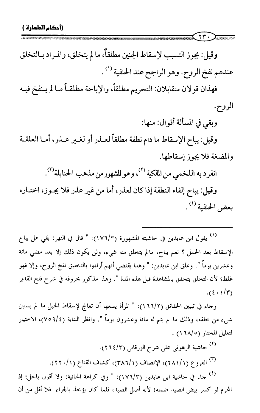 (¬١) يقول ابن عابدين في حاشيته المشهورة (٣/ ١٧٦): "قال في النهر: بقي هل يباح الاسقاط بعد الحمل؟ نعم يباح، ما لم يتخلق منه شيء، ولن يكون ذلك إلا بعد مضي مائة وعشرين يوماً". وعلق ابن عابدين: "وهذا يقتضي أنهم أرادوا بالتخليق نفخ الروح، وإلا فهو غلط؛ لأن التخلق يتحقق بالمشاهدة قبل هذه المدة". وهذا مذكور بحروفه في شرح فتح القدير (٣/ ٤٠١).