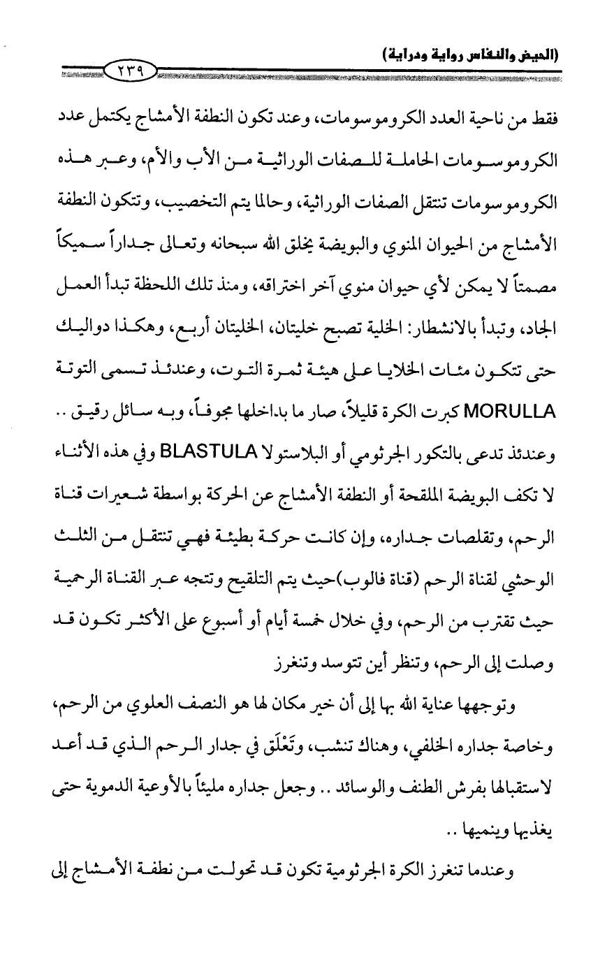 فقط من ناحية العدد الكروموسومات، وعند تكون النطفة الأمشاج يكتمل عدد الكروموسومات الحاملة للصفات الوراثية من الأب والأم، وعبر هذه الكروموسومات تنتقل الصفات الوراثية، وحالما يتم التخصيب، وتتكون النطفة الأمشاج من الحيوان المنوي والبويضة يخلق الله سبحانه وتعالى جداراً سميكاً مصمتاً لا يمكن لأي حيوان منوي آخر اختراقه، ومنذ تلك اللحظة تبدأ العمل الجاد، وتبدأ بالانشطار: الخلية تصبح خليتان، الخليتان أربع، وهكذا دواليك حتى تتكون مئات الخلايا على هيئة ثمرة التوت، وعندئذ تسمى التوتة MORULLA كبرت الكرة قليلاً، صار ما بداخلها مجوفاً، وبه سائل رقيق .. وعندئذ تدعى بالتكور الجرثومي أو البلاستولا BLASTULA وفي هذه الأثناء لا تكف البويضة الملقحة أو النطفة الأمشاج عن الحركة بواسطة شعيرات قناة الرحم، وتقلصات جداره، وإن كانت حركة بطيئة فهي تنتقل من الثلث الوحشي لقناة الرحم (قناة فالوب) حيث يتم التلقيح وتتجه عبر القناة الرحمية حيث تقترب من الرحم، وفي خلال خمسة أيام أو أسبوع على الأكثر تكون قد وصلت إلى الرحم، وتنظر أين تتوسد وتنغرز