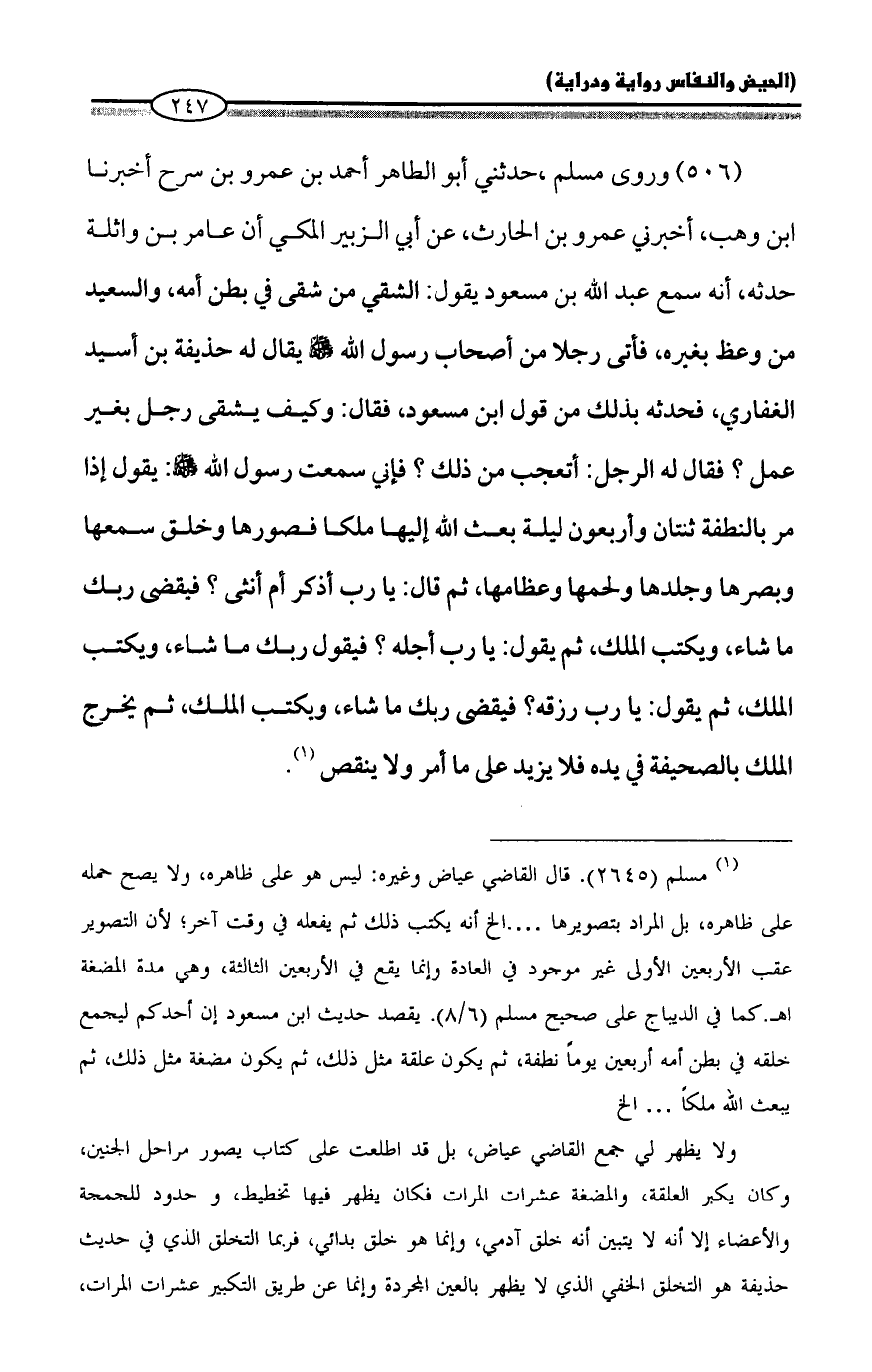 (٥٠٦) وروى مسلم، حدثني أبو الطاهر أحمد بن عمرو بن سرح أخبرنا ابن وهب، أخبرني عمرو بن الحارث، عن أبي الزبير المكي أن عامر بن واثلة حدثه، أنه سمع عبد الله بن مسعود يقول: الشقي من شقى في بطن أمه، والسعيد من وعظ بغيره، فأتى رجلا من أصحاب رسول الله - صلى الله عليه وسلم - يقال له حذيفة بن أسيد الغفاري، فحدثه بذلك من قول ابن مسعود، فقال: وكيف يشقى رجل بغير عمل؟ فقال له الرجل: أتعجب من ذلك؟ فإني سمعت رسول الله - صلى الله عليه وسلم -: يقول إذا مر بالنطفة ثنتان وأربعون ليلة بعث الله إليها ملكا فصورها وخلق سمعها وبصرها وجلدها ولحمها وعظامها، ثم قال: يا رب أذكر أم أنثى؟ فيقضى ربك ما شاء، ويكتب الملك، ثم يقول: يا رب أجله؟ فيقول ربك ما شاء، ويكتب الملك، ثم يقول: يا رب رزقه؟ فيقضى ربك ما شاء، ويكتب الملك، ثم يخرج الملك بالصحيفة في يده فلا يزيد على ما أمر ولا ينقص (¬١).