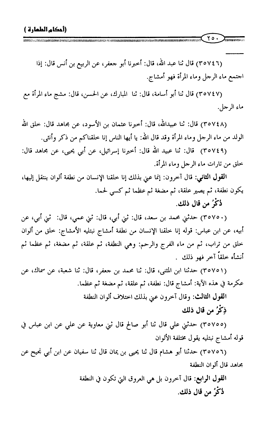 (٣٥٧٤٦) قال ثنا عبد الله، قال: أخبرنا أبو جعفر، عن الربيع بن أنس قال: إذا اجتمع ماء الرجل وماء المرأة فهو أمشاج.