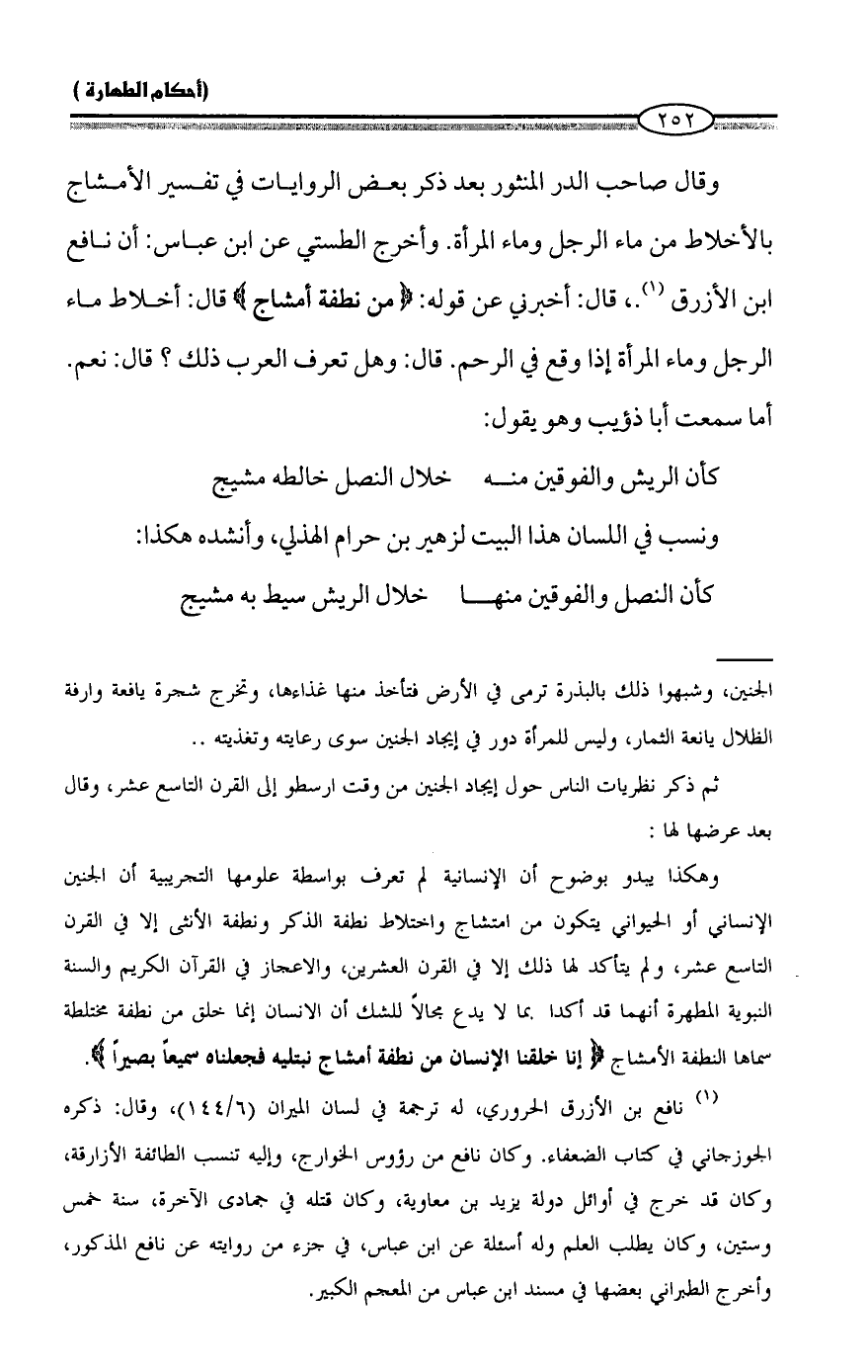 وقال صاحب الدر المنثور بعد ذكر بعض الروايات في تفسير الأمشاج بالأخلاط من ماء الرجل وماء المرأة. وأخرج الطستي عن ابن عباس: أن نافع ابن الأزرق (¬١).، قال: أخبرني عن قوله: {مِنْ نُطْفَةٍ أَمْشَاجٍ} قال: أخلاط ماء الرجل وماء المرأة إذا وقع في الرحم. قال: وهل تعرف العرب ذلك؟ قال: نعم. أما سمعت أبا ذؤيب وهو يقول:
