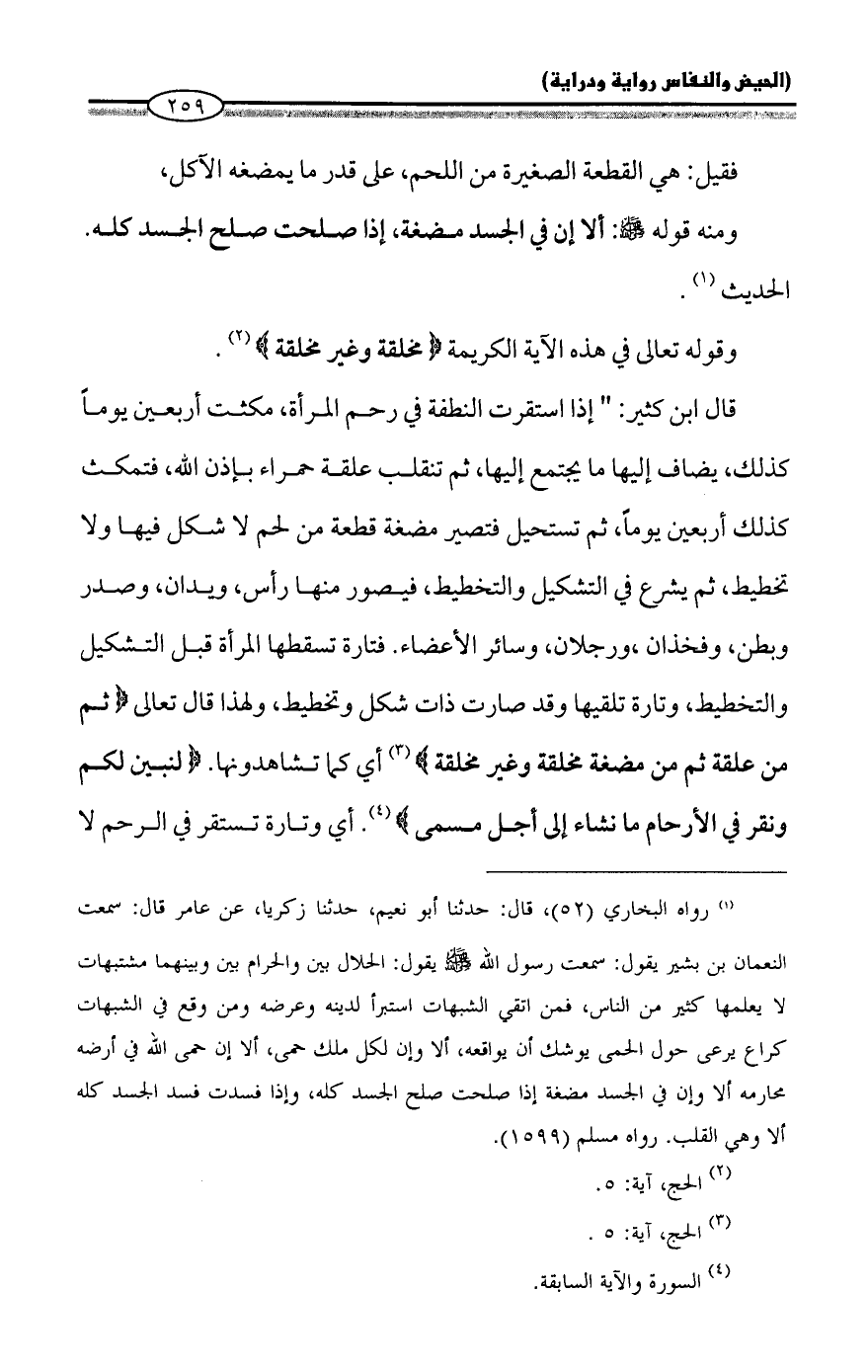 قال ابن كثير: "إذا استقرت النطفة في رحم المرأة، مكثت أربعين يوماً كذلك، يضاف إليها ما يجتمع إليها، ثم تنقلب علقة حمراء بإذن الله، فتمكث كذلك أربعين يوماً، ثم تستحيل فتصير مضغة قطعة من لحم لا شكل فيها ولا تخطيط، ثم يشرع في التشكيل والتخطيط، فيصور منها رأس، ويدان، وصدر وبطن، وفخذان، ورجلان، وسائر الأعضاء. فتارة تسقطها المرأة قبل التشكيل والتخطيط، وتارة تلقيها وقد صارت ذات شكل وتخطيط، ولهذا قال تعالى {ثُمَّ مِنْ عَلَقَةٍ ثُمَّ مِنْ مُضْغَةٍ مُخَلَّقَةٍ وَغَيْرِ مُخَلَّقَةٍ} (¬٣) أي كما تشاهدونها. {لِنُبَيِّنَ لَكُمْ وَنُقِرُّ فِي الْأَرْحَامِ مَا نَشَاءُ إِلَى أَجَلٍ مُسَمًّى} (¬٤). أي وتارة تستقر في الرحم لا