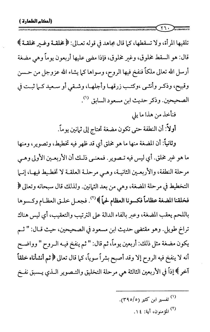 وثانياً: أن المضغة منها ما هو مخلق أي قد ظهر فيه تخطيط، وتصوير، ومنها ما هو غير مخلق. أي ليس فيه تصوير. فمعنى ذلك أن الأربعين الأولى وهي مرحلة النطفة، والأربعين الثانية، وهي مرحلة العلقة لا تخطيط فيها، إنما التخطيط في مرحلة المضغة، وهي من بعد الثمانين. ولذلك قال سبحانه وتعالى {فَخَلَقْنَا الْمُضْغَةَ عِظَامًا فَكَسَوْنَا الْعِظَامَ لَحْمًا} (¬٢). فجعل خلق العظام وكسوها باللحم يعقب المضغة، وعبر بالفاء الدالة على الترتيب والتعقيب، أي ليس هناك تراخ طويل. وهو مقتضى حديث ابن مسعود في الصحيحين، حيث قال: "ثم يكون مضغة مثل ذلك: أربعين يوماً، ثم قال: "ثم ينفخ فيه الروح" وواضح أنه لا ينفخ فيه الروح إلا وقد أصبح بشراً سوياً، كما قال تعالى {ثُمَّ أَنْشَأْنَاهُ خَلْقًا آخَرَ} إذاً في الأربعين الثالثة هي مرحلة التخليق والتصوير الذي يسبق نفخ
