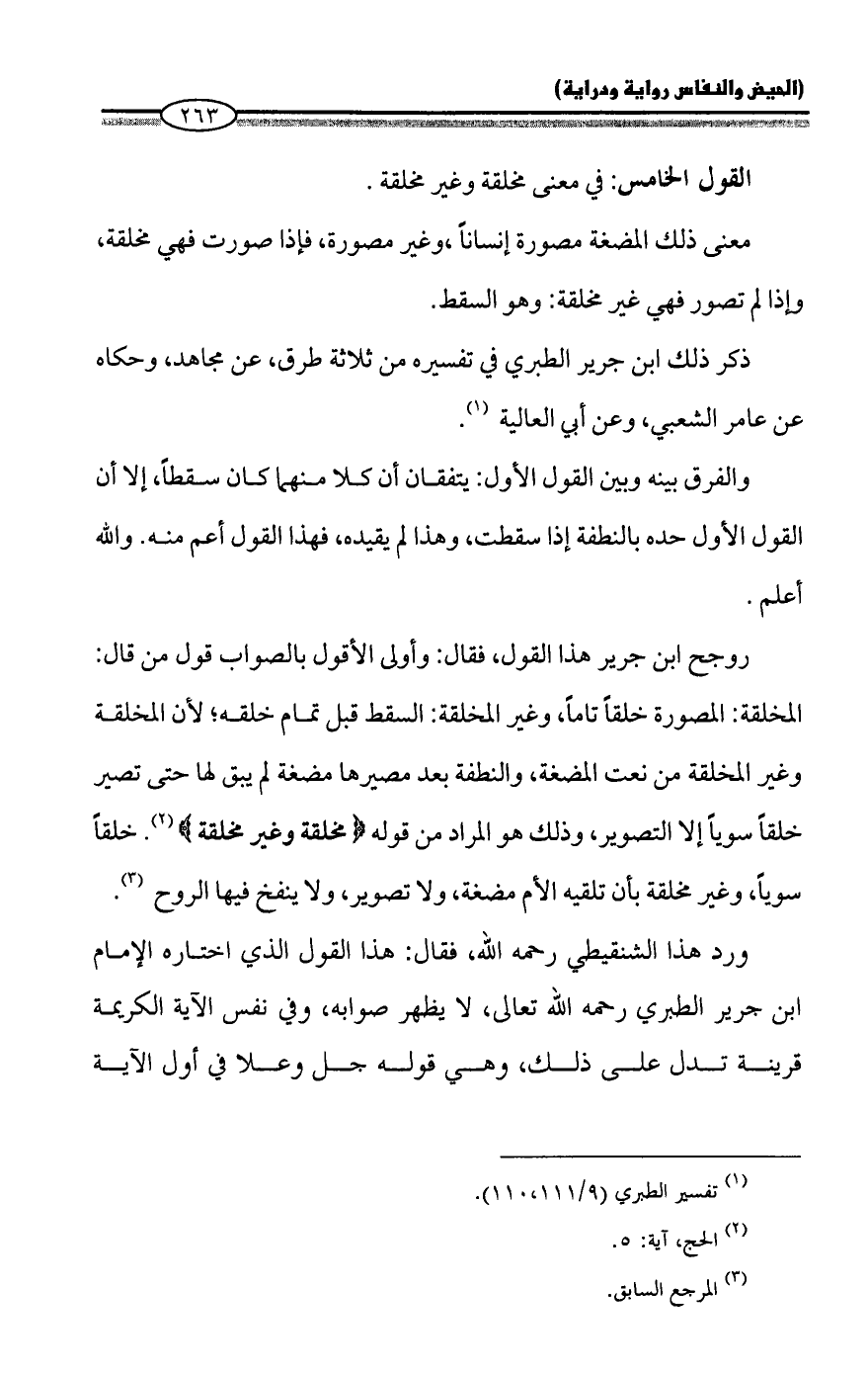 روجح ابن جرير هذا القول، فقال: وأولى الأقول بالصواب قول من قال: المخلقة: المصورة خلقاً تاماً، وغير المخلقة: السقط قبل تمام خلقه؛ لأن المخلقة وغير المخلقة من نعت المضغة، والنطفة بعد مصيرها مضغة لم يبق لها حتى تصير خلقاً سوياً إلا التصوير، وذلك هو المراد من قوله {مُخَلَّقَةٍ وَغَيْرِ مُخَلَّقَةٍ} (¬٢). خلقاً سوياً، وغير مخلقة بأن تلقيه الأم مضغة، ولا تصوير، ولا ينفخ فيها الروح (¬٣).