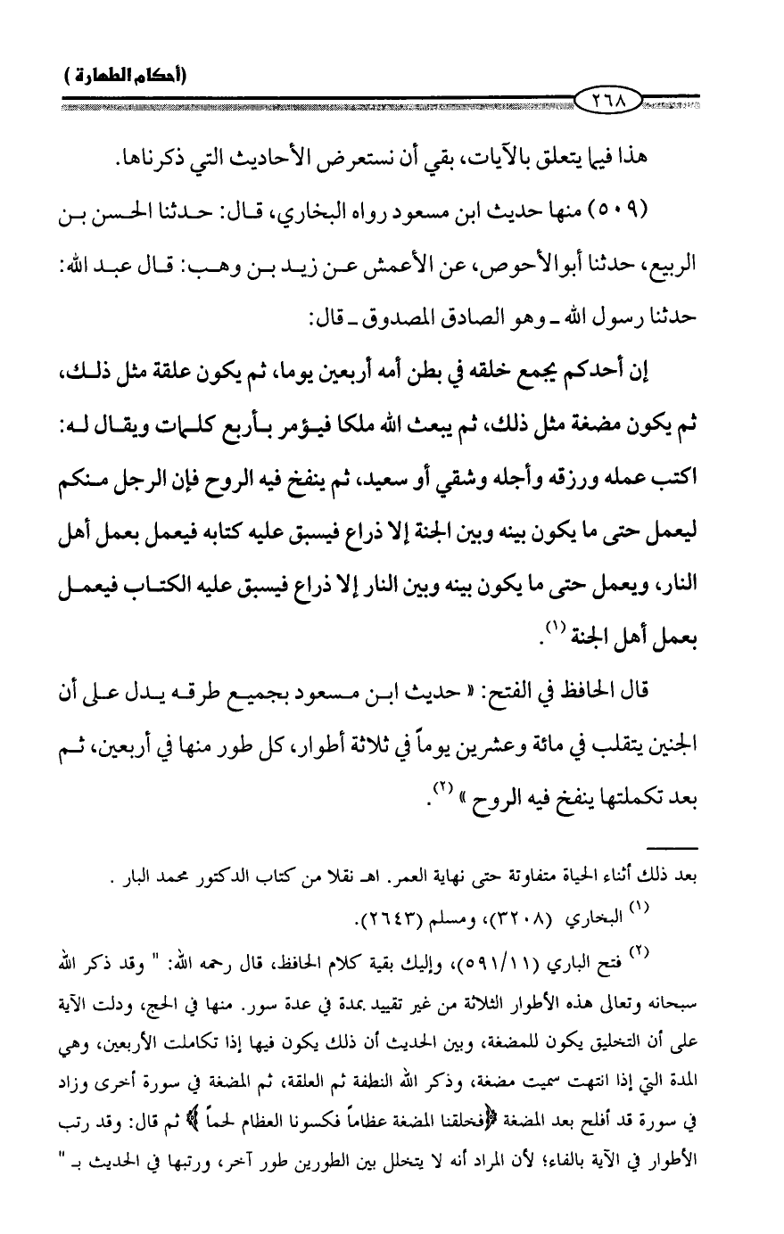 (¬٢) فتح الباري (١١/ ٥٩١)، وإليك بقية كلام الحافظ، قال رحمه الله: "وقد ذكر الله سبحانه وتعالى هذه الأطوار الثلاثة من غير تقييد بمدة في عدة سور. منها في الحج، ودلت الآية على أن التخليق يكون للمضغة، وبين الحديث أن ذلك يكون فيها إذا تكاملت الأربعين، وهي المدة التي إذا انتهت سميت مضغة، وذكر الله النطفة ثم العلقة، ثم المضغة في سورة أخرى وزاد في سورة قد أفلح بعد المضغة {فَخَلَقْنَا الْمُضْغَةَ عِظَامًا فَكَسَوْنَا الْعِظَامَ لَحْمًا} ثم قال: وقد رتب الأطوار في الآية بالفاء؛ لأن المراد أنه لا يتخلل بين الطورين طور آخر، ورتبها في الحديث بـ "