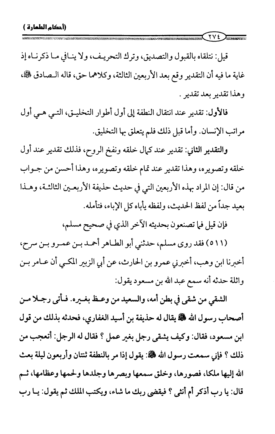والتقدير الثاني: تقدير عند كمال خلقه ونفخ الروح، فذلك تقدير عند أول خلقه وتصويره، وهذا تقدير عند تمام خلقه وتصويره، وهذا أحسن من جواب من قال: إن المراد بهذه الأربعين التي في حديث حذيفة الأربعين الثالثة، وهذا بعيد جداً من لفظ الحديث، ولفظه يأباه كل الإباء، فتأمله.