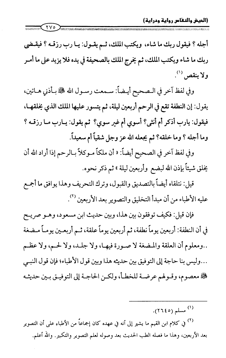 (¬٢) في كلام ابن القيم ما يشير إلى أنه في عهده كان إجماعاً من الأطباء على أن التصوير بعد الأربعين، وهذا ما فصله الطب الحديث بعد وصوله لعلم التصوير والتكبير. والله أعلم.