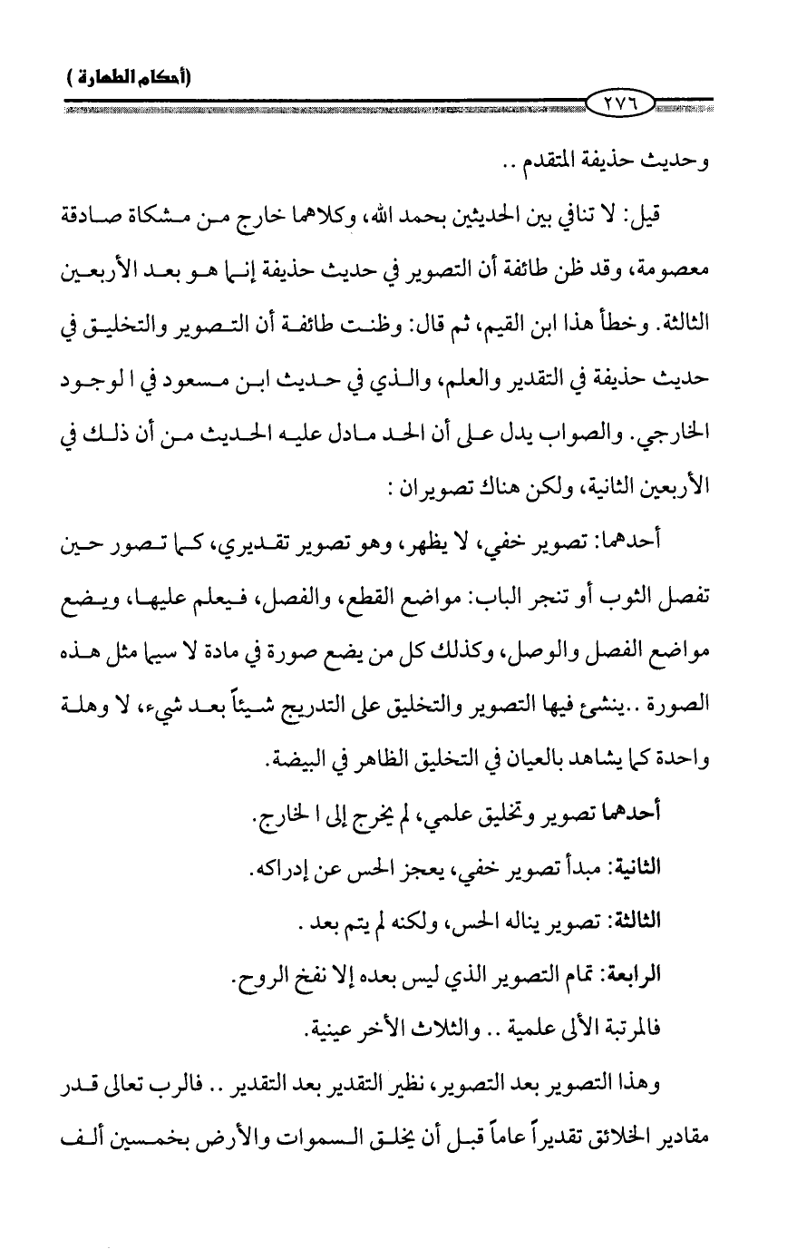 أحدهما: تصوير خفي، لا يظهر، وهو تصوير تقديري، كما تصور حين تفصل الثوب أو تنجر الباب: مواضع القطع، والفصل، فيعلم عليها، ويضع مواضع الفصل والوصل، وكذلك كل من يضع صورة في مادة لا سيما مثل هذه الصورة .. ينشئ فيها التصوير والتخليق على التدريج شيئاً بعد شيء، لا وهلة واحدة كما يشاهد بالعيان في التخليق الظاهر في البيضة.