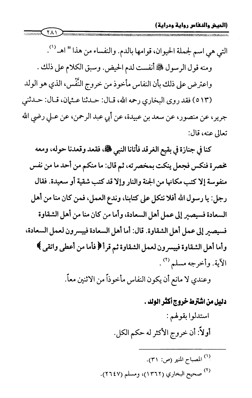 واعترض على ذلك بأن النفاس مأخوذ من خروج النَّفْس، الذي هو الولد (٥١٣) فقد روى البخاري رحمه الله، قال: حدثنا عثمان، قال: حدثني جرير، عن منصور، عن سعد بن عبيدة، عن أبي عبد الرحمن، عن علي رضي الله تعالى عنه، قال: