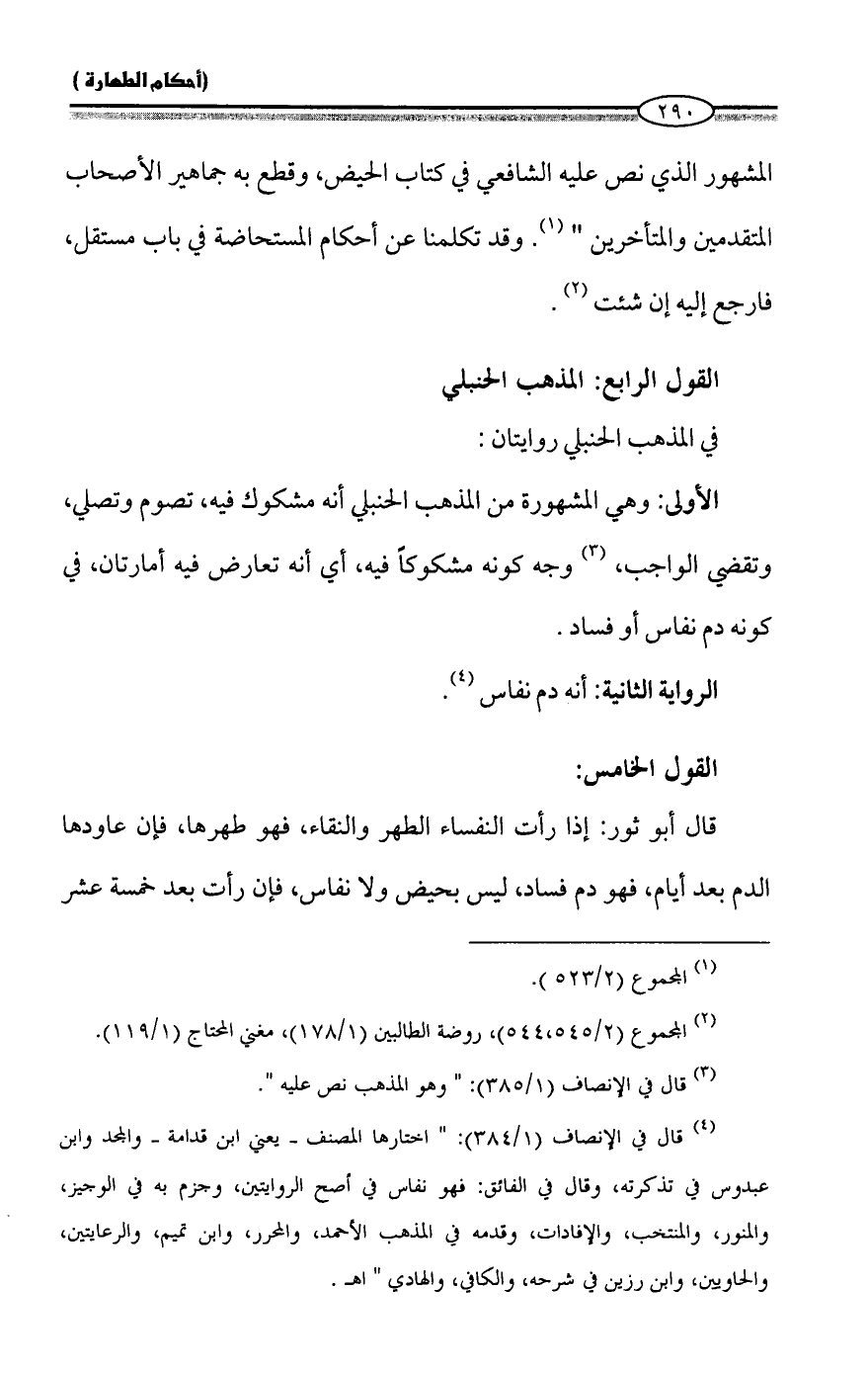 المشهور الذي نص عليه الشافعي في كتاب الحيض، وقطع به جماهير الأصحاب المتقدمين والمتأخرين" (¬١). وقد تكلمنا عن أحكام المستحاضة في باب مستقل، فارجع إليه إن شئت (¬٢).