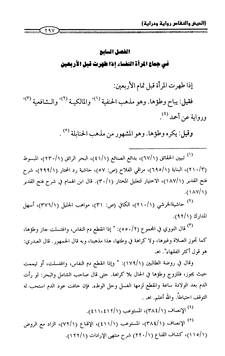 (¬٣) قال النووي في المجموع (٢/ ٥٥٠): "إذا انقطع دم النفاس، واغتسلت جاز وطؤها، كما تجوز الصلاة وغيرها، ولا كراهة في وطئها، هذا مذهبنا، وبه قال الجمهور. قال العبدري: هو قول أكثر الفقهاء". اهـ