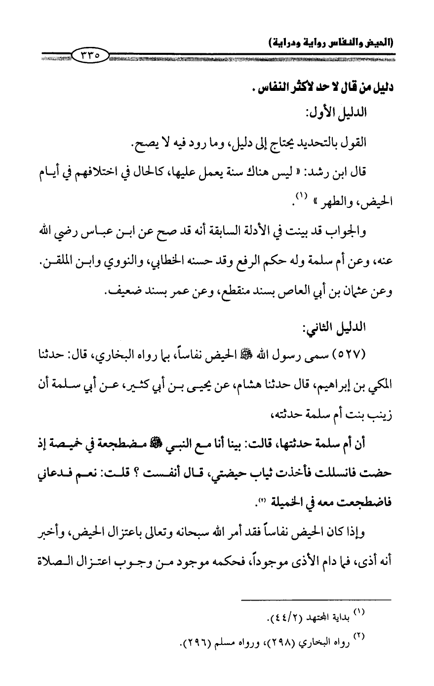 (٥٢٧) سمى رسول الله - صلى الله عليه وسلم - الحيض نفاساً، بما رواه البخاري، قال: حدثنا المكي بن إبراهيم، قال حدثنا هشام، عن يحيى بن أبي كثير، عن أبي سلمة أن زينب بنت أم سلمة حدثته،