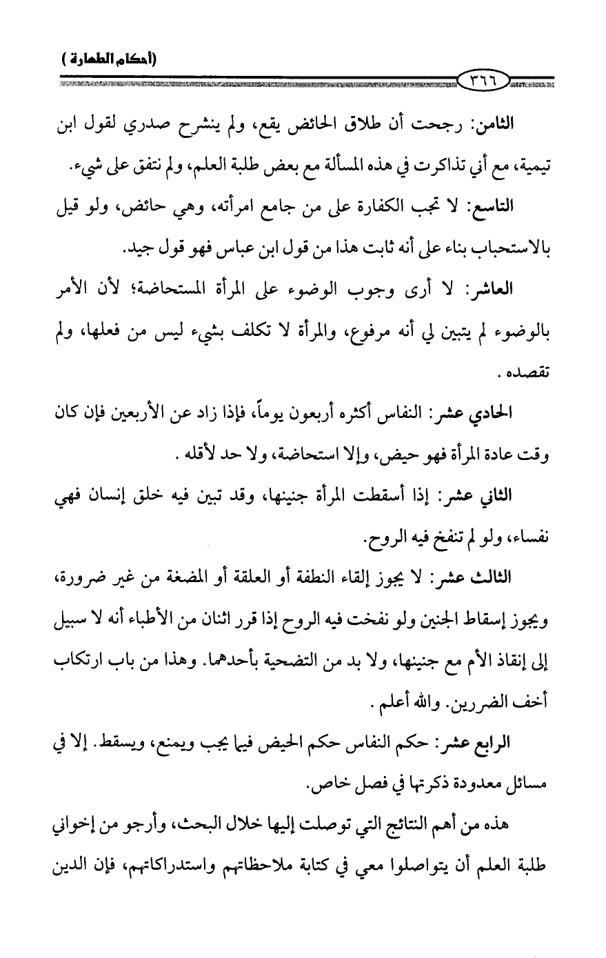 الثامن: رجحت أن طلاق الحائض يقع، ولم ينشرح صدري لقول ابن تيمية، مع أني تذاكرت في هذه المسألة مع بعض طلبة العلم، ولم نتفق على شيء.