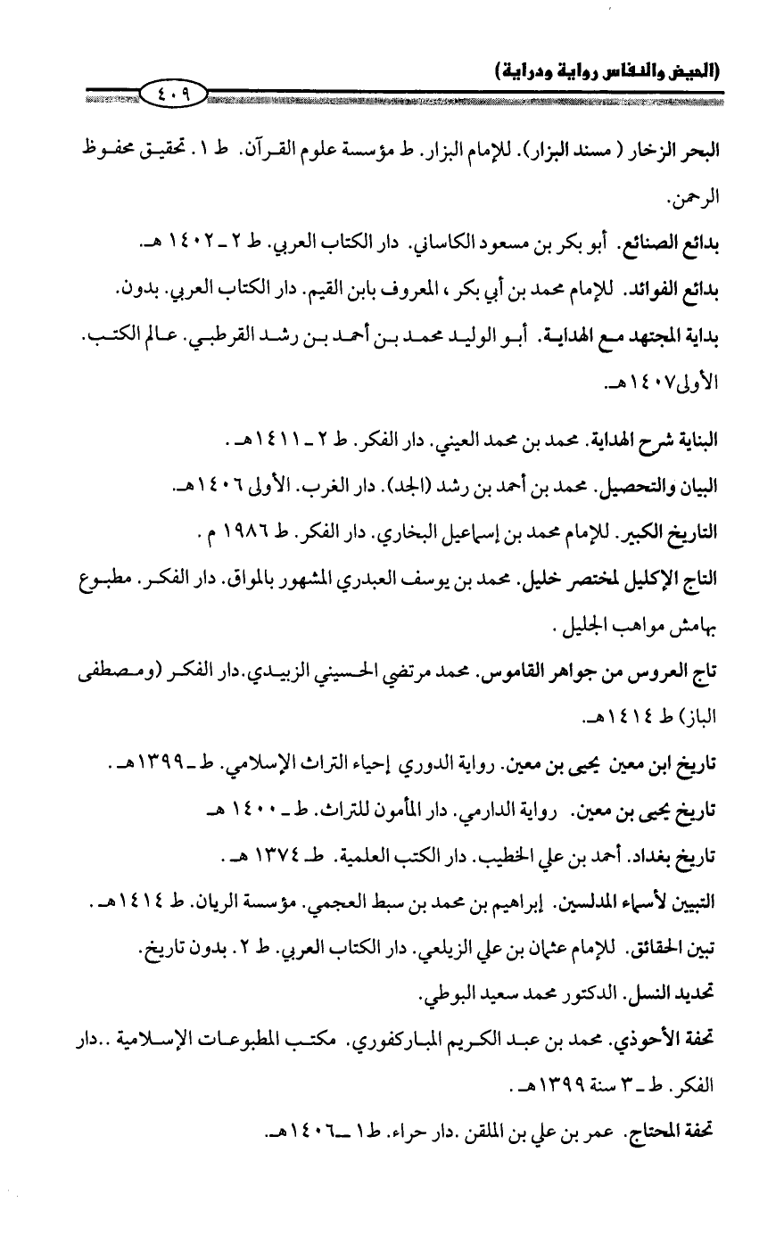 البحر الزخار (مسند البزار). للإمام البزار. ط مؤسسة علوم القرآن. ط ١. تحقيق محفوظ الرحمن.