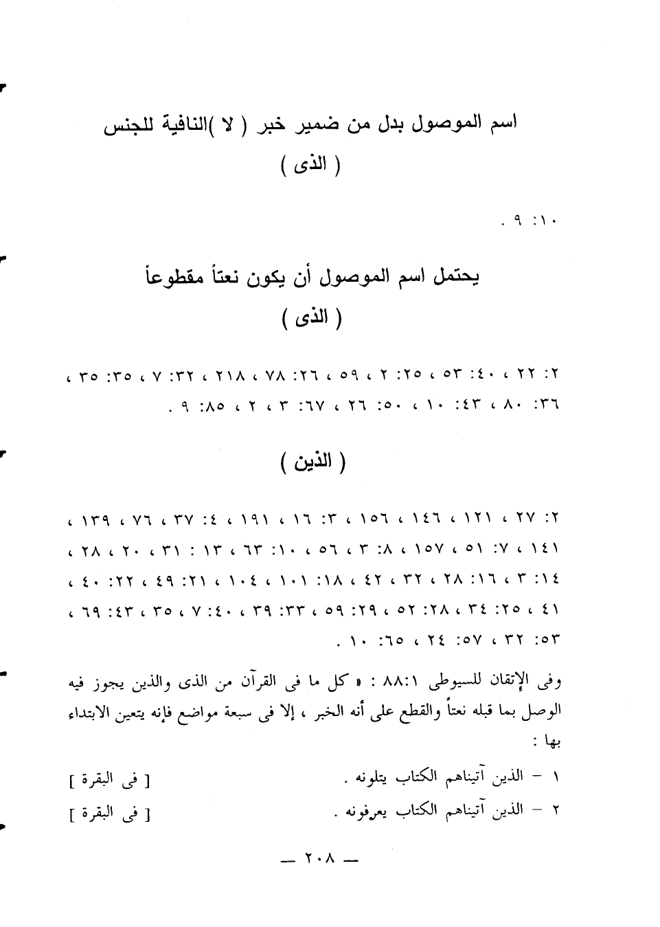 وفي الإتقان للسيوطي 1: 88: «كل ما في القرآن من الذي والذين يجوز فيه الوصل بما قبله نعتًا والقطع على أنه الخبر، إلا في سبعة مواضع فإنه يتعين الابتداء بها: