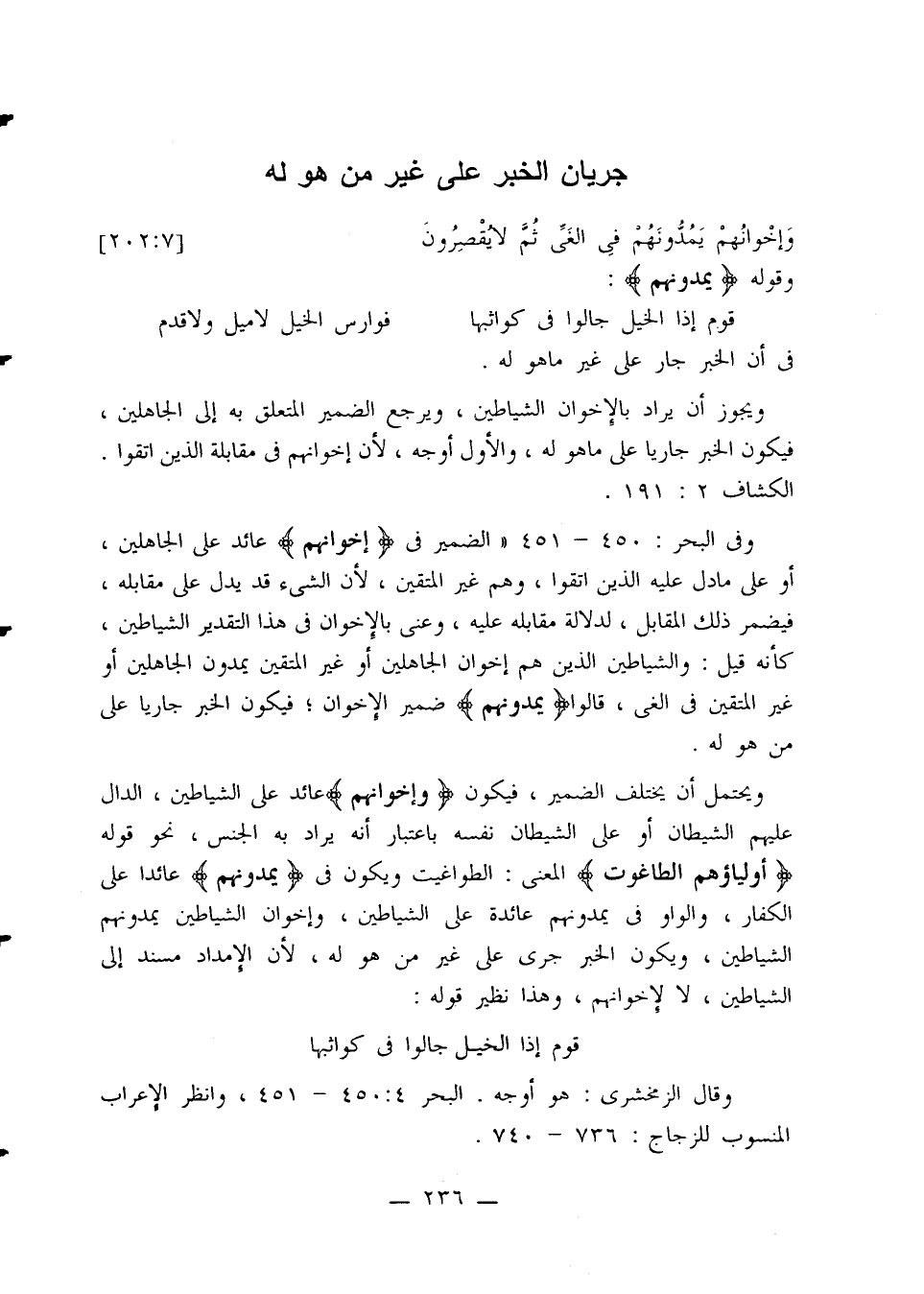 وفي البحر: 450 - 451: «الضمير في {إخوانهم} عائد على الجاهلين، أو على ما دل عليه الذين اتقوا، وهم غير المتقين، لأن الشيء قد يدل على مقابله، فيضمر ذلك المقابل، لدلالة مقابله عليه، وعنى بالإخوان في هذا التقدير الشياطين، كأنه قيل: والشياطين الذين هم إخوان الجاهلين أو غير المتقين يمدون الجاهلين أو غير المتقين في الغي، قالوا {يمدونهم} ضمير الإخوان؛ فيكون الخبر جاريًا على من هو له.