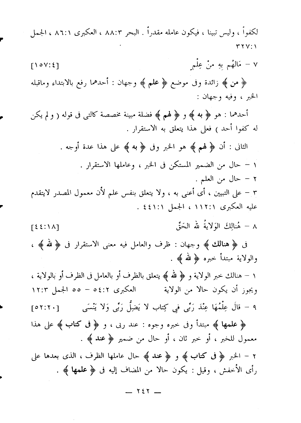 3 - على التبيين، أي أعني به، ولا يتعلق بنفس علم لأن معمول المصدر لا يتقدم عليه العكبري 1: 112، الجمل 1: 441.