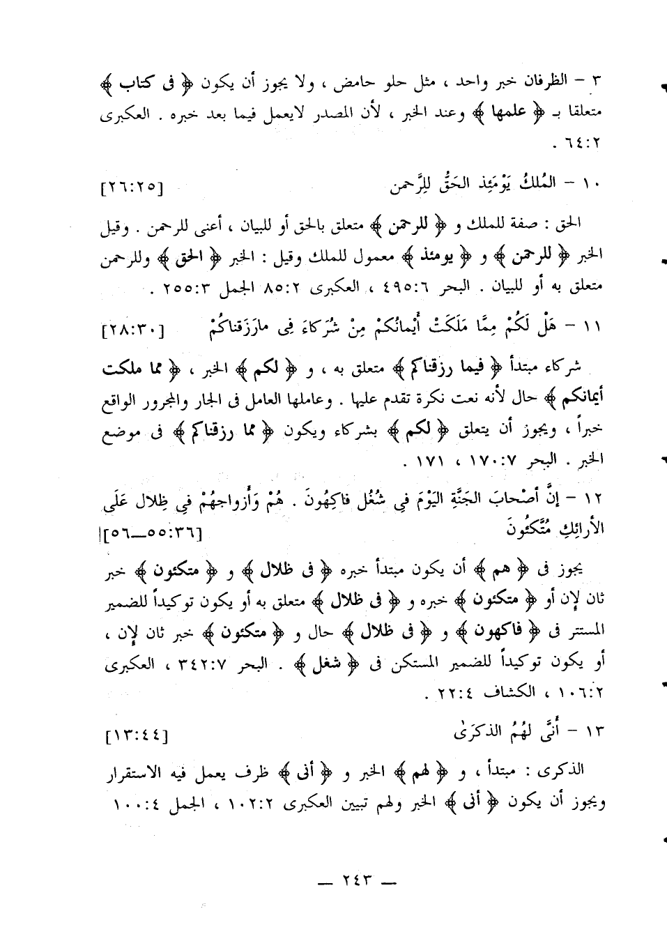 3 - الظرفان خبر واحد، مثل حلو حامض، ولا يجوز أن يكون {في كتاب} متعلقًا بـ {علمها} وعند الخبر، لأن المصدر لا يعمل فيما بعد خبره. العكبري 2: 64.