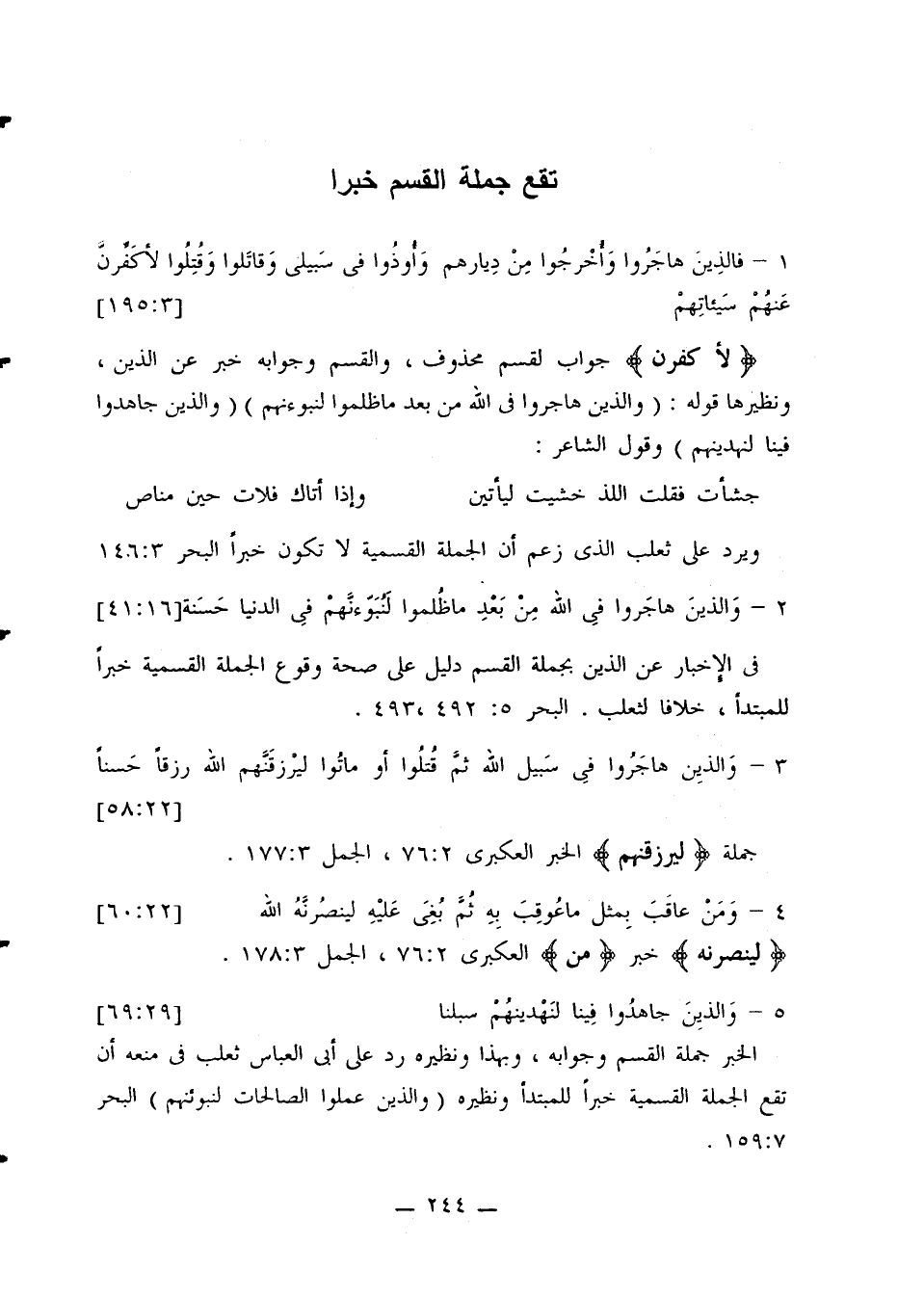 في الإخبار عن الذين بجملة القسم دليل على صحة وقوع الجملة القسمية خبرًا للمبتدأ، خلافًا لثعلب. البحر 5: 492، 493.