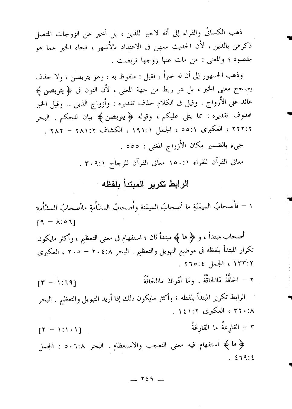 وذهب الجمهور إلى أن له خبرًا، فقيل: ملفوظ به، وهو يتربصن، ولا حذف يصحح معنى الخبر، بل هو ربط من جهة المعنى، لأن النون في {يتربصن} عائد على الأزواج. وقيل في الكلام حذف تقديره: وأزواج الذين. . . وقيل الخبر محذوف تقديره: مما يتلى عليكم، وقوله {يتربصن} بيان للحكم. البحر 2: 222، العكبري 1: 55، الجمل 1: 191، الكشاف 2: 281 - 282.