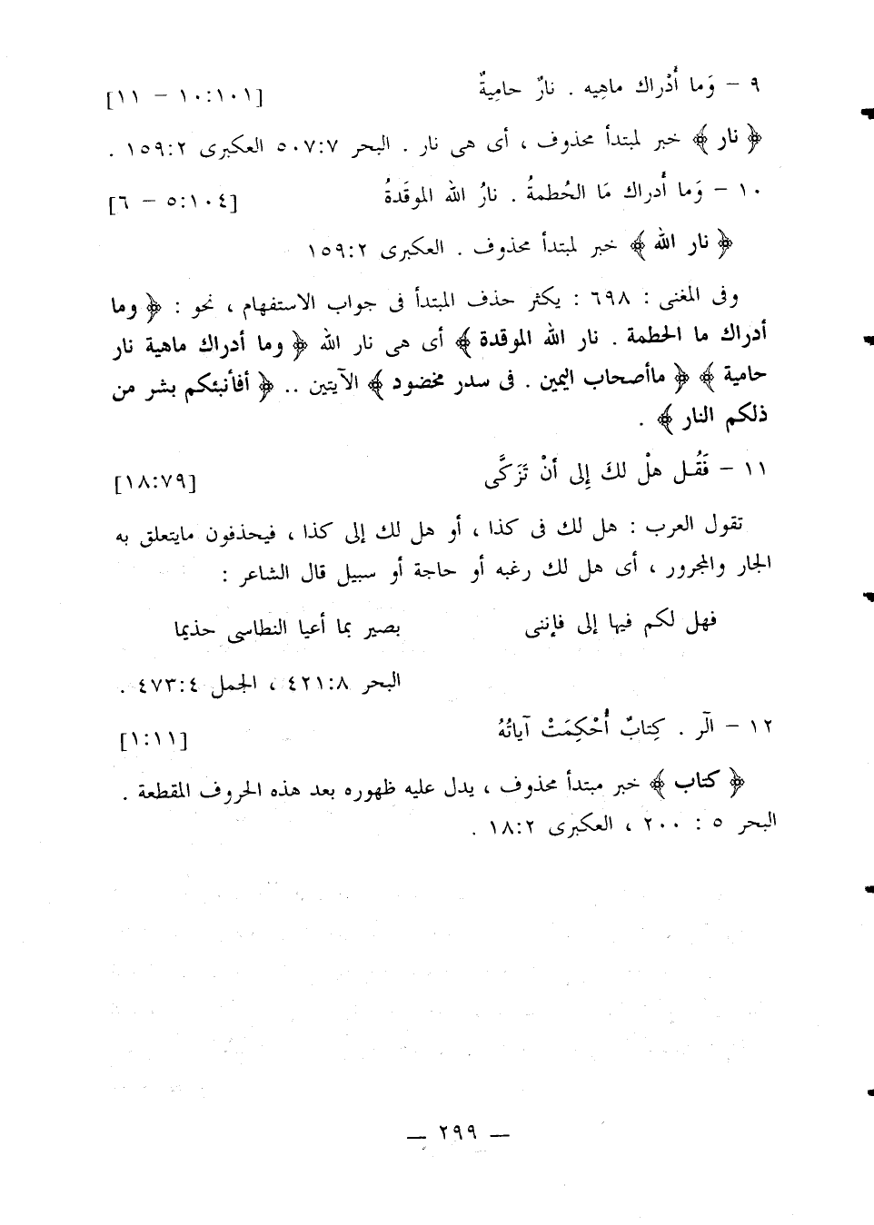 وفي المغني: 698: يكثر حذف المبتدأ في جواب الاستفهام، نحو: {وما أدراك ما الحطمة. نار الله الموقدة} أي هي نار الله {وما أدراك ماهية نار حامية} {ما أصحاب اليمين. في سدر مخضود} الآيتين. . . {أفأنبئكم بشر من ذلكم النار}.