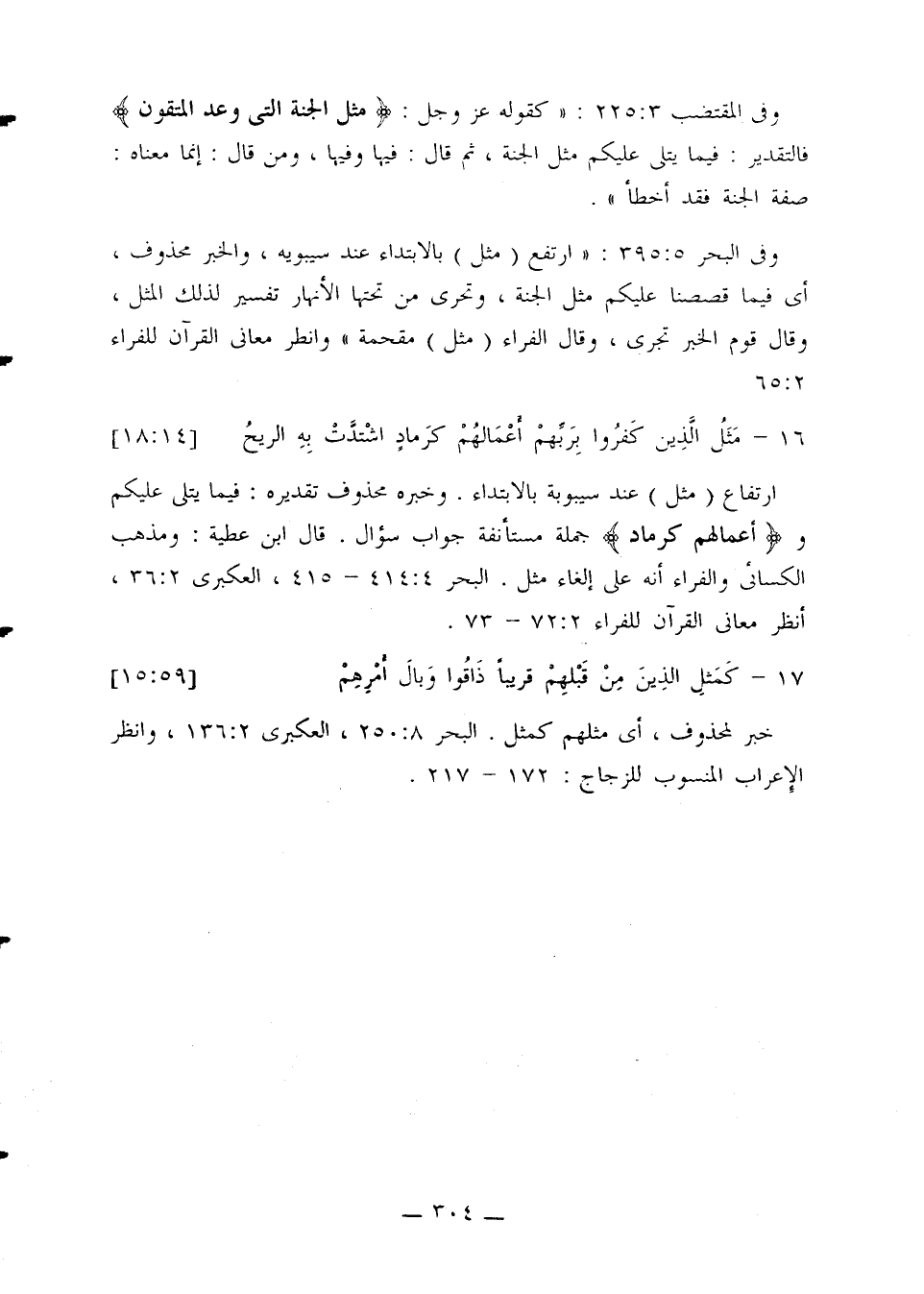 وفي المقتضب 3: 225: «كقوله عز وجل: {مثل الجنة التي وعد المتقون} فالتقدير: فيما يتلى عليكم مثل الجنة، ثم قال: فيها وفيها، ومن قال: إنما معناه: صفة الجنة فقد أخطأ».