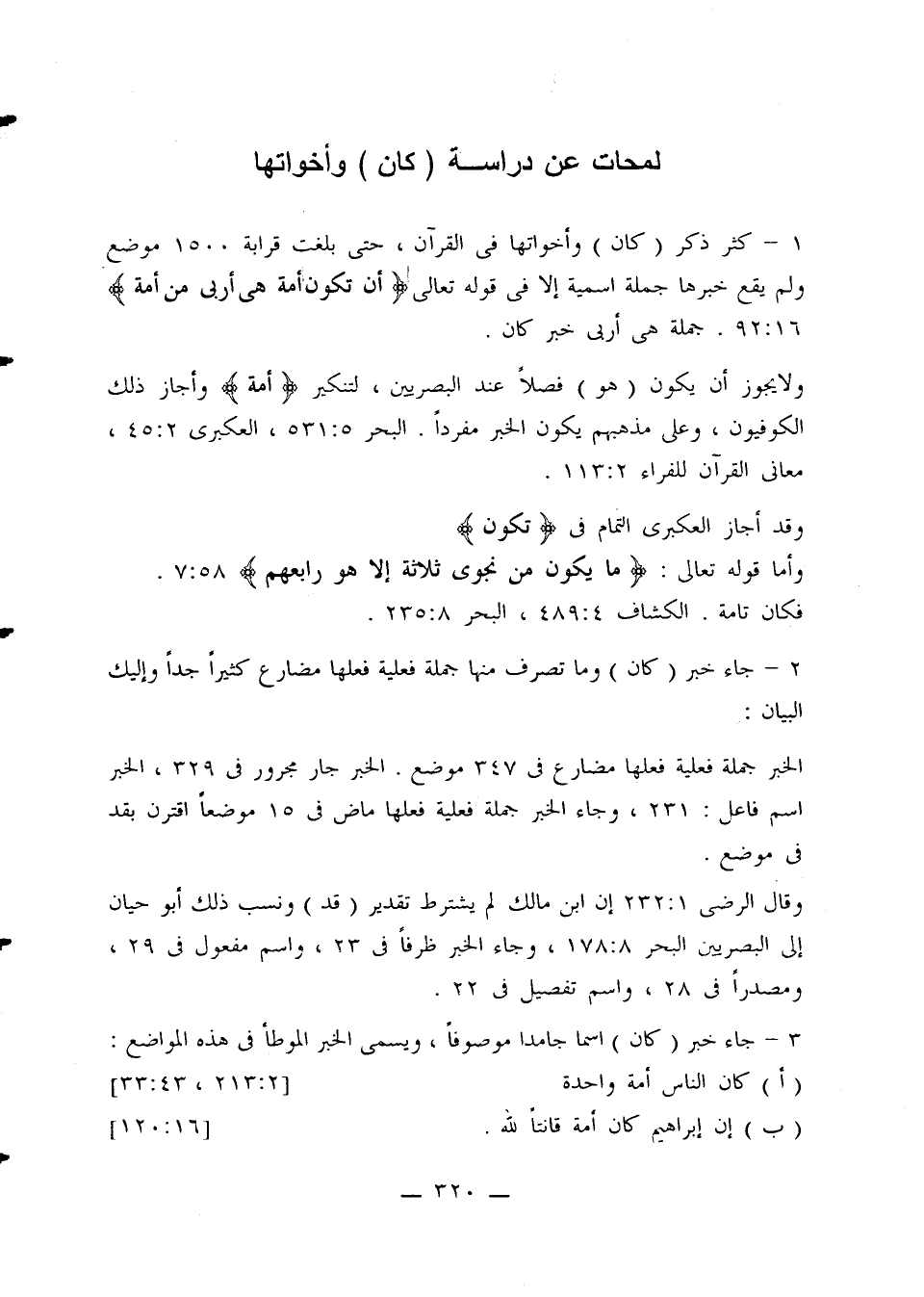 1 - كثر ذكر (كان) وأخواتها في القرآن، حتى بلغت قرابة 1500 موضع ولم يقع خبرها جملة اسمية إلا في قوله تعالى {أن تكون أمة هي أربى من أمة} 16: 92. جملة هي أربى خبر كان.