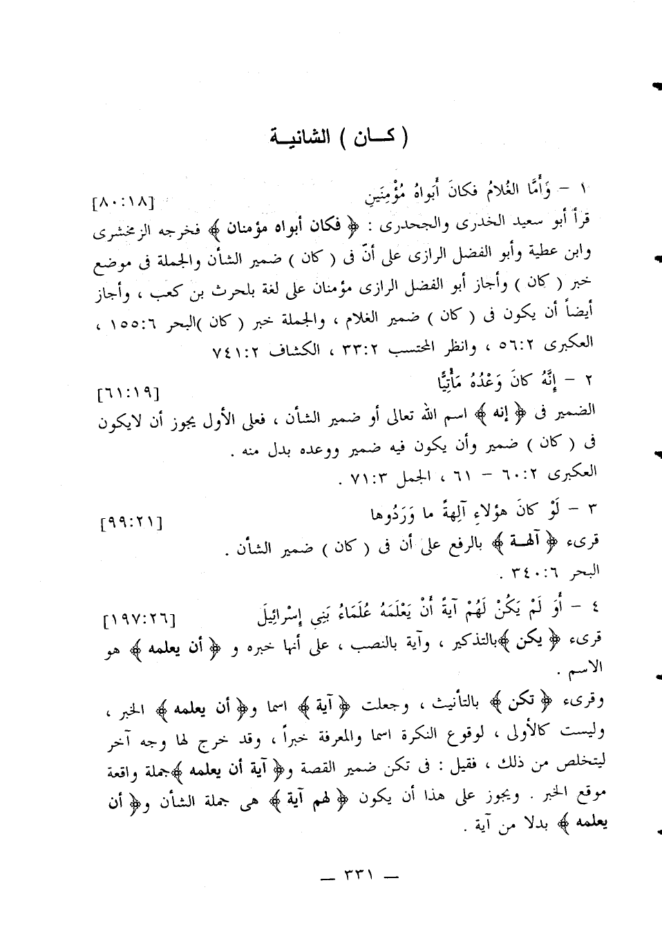 قرأ أبو سعيد الخدري والجحدري: (فكان أبواه مؤمنان) فخرجه الزمخشري وابن عطية وأبو الفضل الرازي على أن في (كان) ضمير الشأن والجملة في موضع خبر (كان) وأجاز أبو الفضل الرازي مؤمنان على لغة بلحرث بن كعب، وأجاز أيضًا أن يكون في (كان) ضمير الغلام، والجملة خبر (كان) البحر 6: 155، العكبري 2: 56، وانظر المحتسب 2: 33، الكشاف 2: 741.