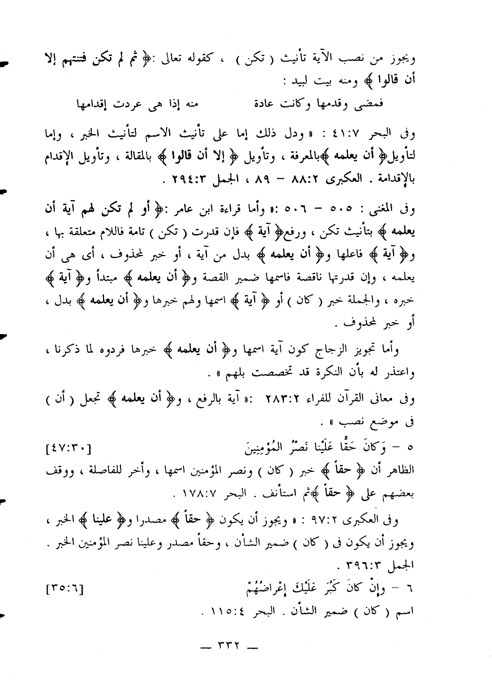 وفي المغني: 505 - 506: «وأما قراءة ابن عامر: {أولم تكن لهم آية أن يعلمه} بتأنيث تكن، ورفع {آية} فإن قدرت (تكن) تامة فاللام متعلقة بها، و {آية} فاعلها و {أن يعلمه} بدل من آية، أو خبر لمحذوف، أي هي أن يعلمه، وإن قدرتها ناقصة فاسمها ضمير القصة و {أن يعلمه} مبتدأ و {آية} خبره، والجملة خبر (كان) أو {آية} اسمها ولهم خبرها و {أن يعلمه} بدل، أو خبر لمحذوف.