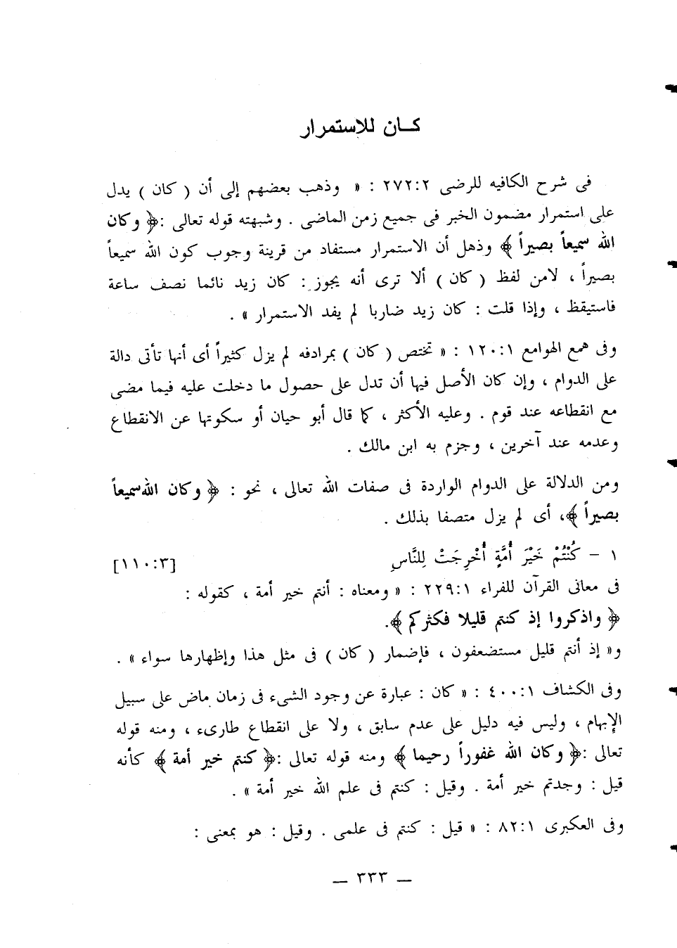 في شرح الكافية للرضي 2: 272: «وذهب بعضهم إلى أن (كان) يدل على استمرار مضمون الخبر في جميع زمن الماضي. وشبهته قوله تعالى: {وكان الله سميعا بصيرا} وذهل أن الاستمرار مستفاد من قرينة وجوب كون الله سميعًا بصيرًا، لا من لفظ (كان) ألا ترى أنه يجوز: كان زيد نائمًا نصف ساعة فاستيقظ، وإذا قلت: كان زيد ضاربا لم يفد الاستمرار».