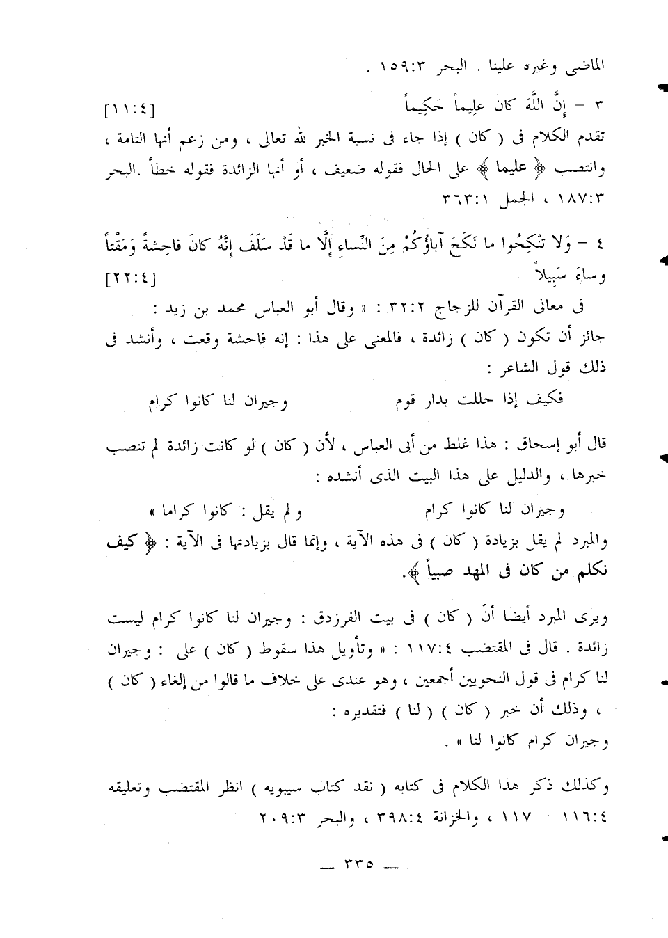 في معاني القرآن للزجاج 2: 32: «وقال أبو العباس محمد بن زيد: جائز أن تكون (كان) زائدة، فالمعنى على هذا: إنه فاحشة وقعت، وأنشد في ذلك قول الشاعر:
