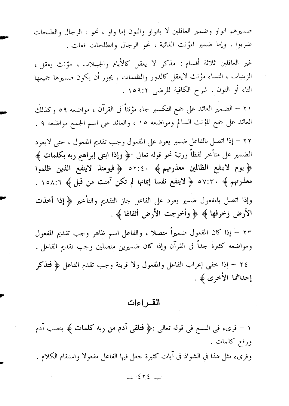 22 - إذا اتصل بالفاعل ضمير يعود على المفعول وجب تقديم المفعول، حتى لا يعود الضمير على متأخر لفظًا ورتبة نحو قوله تعالى: {وإذا ابتلى إبراهيم ربه بكلمات} {يوم لا ينفع الظالمين معذرتهم} 40: 52 {فيومئذ لا ينفع الذين ظلموا معذرتهم} 30: 57 {لا ينفع نفسا إيمانها لم تكن آمنت من قبل} 6: 158.