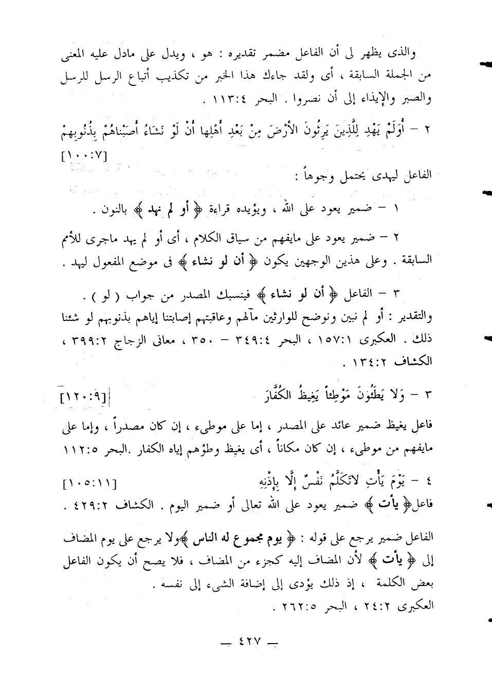 2 - ضمير يعود على ما يفهم من سياق الكلام، أي أو لم يهد ما جرى للأمم السابقة. وعلى هذين الوجهين يكون {أن لو نشاء} في موضع المفعول ليهد.