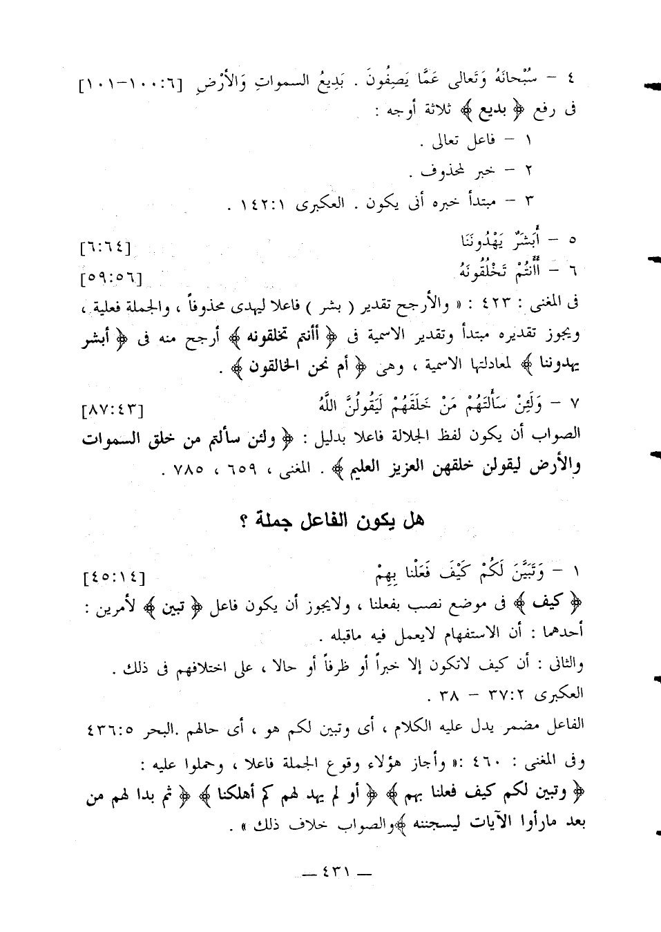 في المغني: 423: «والأرجح تقدير (بشر) فاعلاً ليهدي محذوفًا، والجملة فعلية، ويجوز تقديره مبتدأ وتقدير الاسمية في {أأنتم تخلقونه} أرجح منه في {أبشر يهدوننا} لمعادلتها الاسمية، وهي {أم نحن الخالقون}».