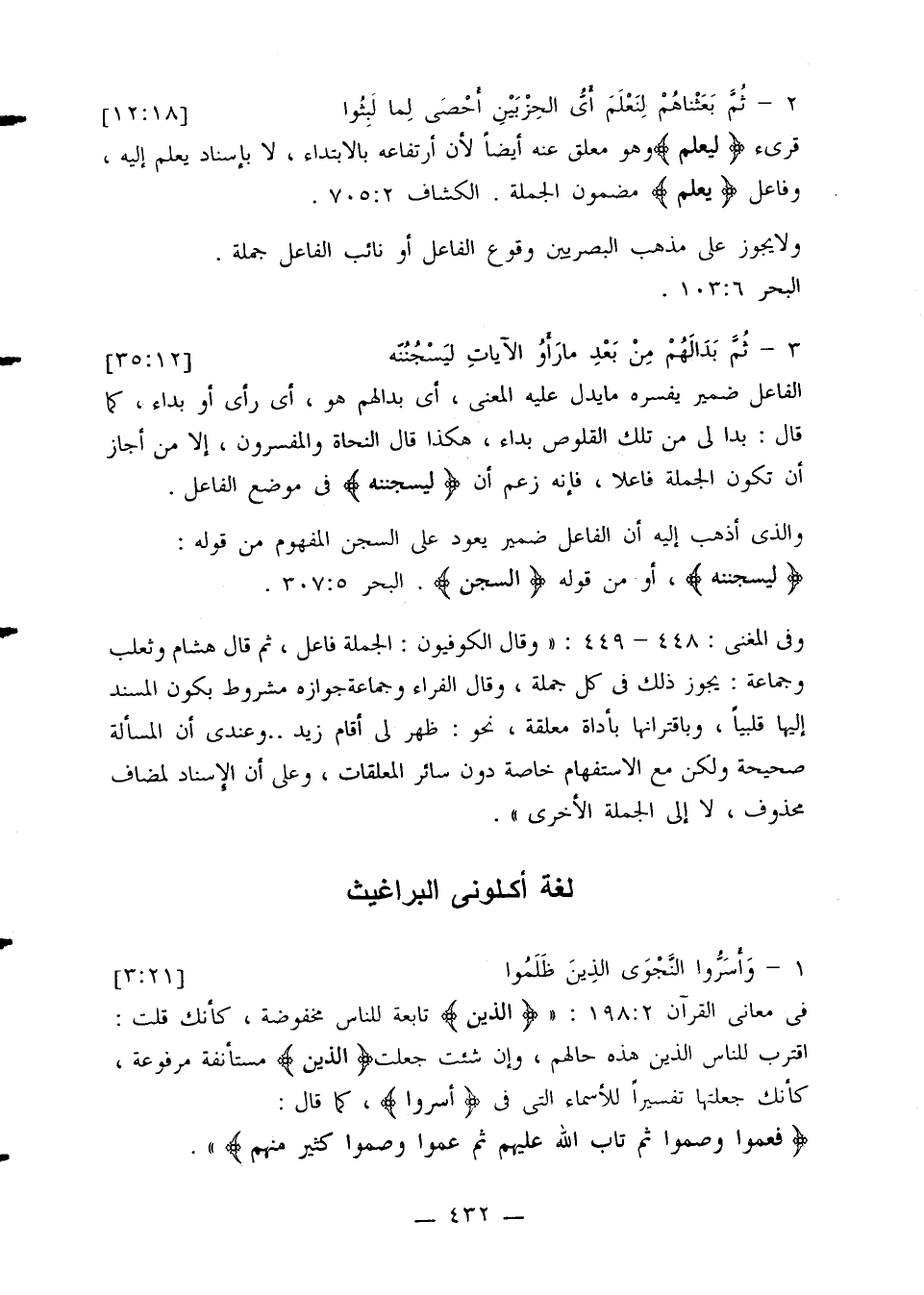 وفي المعنى: 448 - 449: «وقال الكوفيون: الجملة فاعل، ثم قال هشام وثعلب وجماعة: يجوز ذلك في كل جملة، وقال الفراء وجامعة جوازه مشروط بكون المسند إليها قلبيًا، وباقترانها بأداة معلقة، نحو: ظهر لي أقام زيد. . . وعندي أن المسألة صحيحة ولكن مع الاستفهام خاصة دون سائر المعلقات، وعلى أن الإسناد لمضاف محذوف، لا إلى الجملة الأخرى».
