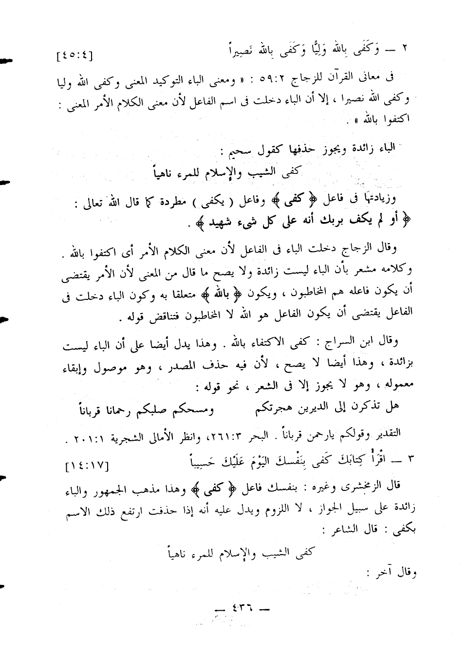 في معاني القرآن للزجاج 2: 59: «ومعنى الباء التوكيد المعنى وكفى الله وليا وكفى الله نصيرا، إلا أن الباء دخلت في اسم الفاعل لأن معنى الكلام الأمر المعنى: اكتفوا بالله».