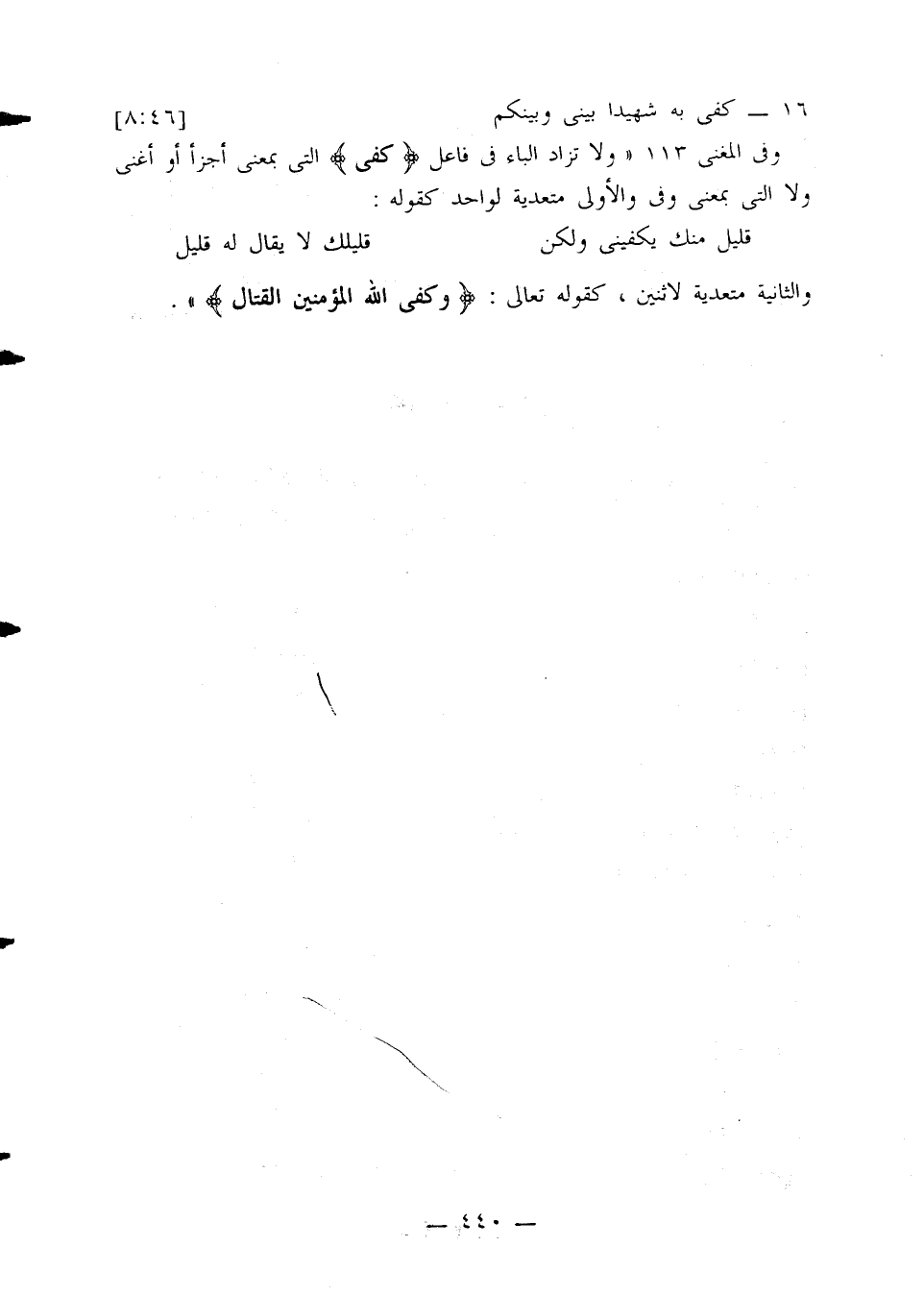 وفي المغني 113: «ولا تزاد الباء في فاعل {كفى} التي بمعنى أجزأ أو أغنى ولا التي بمعنى وفي الأول متعدية لواحد كقوله: