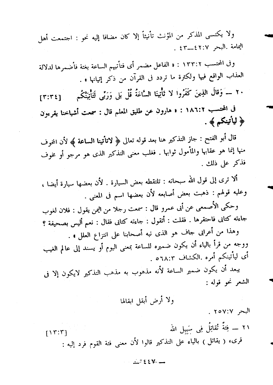 وفي المحتسب 2: 133: «الفاعل مضمر أي فتأتيهم الساعة بغتة فأضمرها لدلالة العذاب الواقع فيها ولكثرة ما تردد في القرآن من ذكر إتيانها».