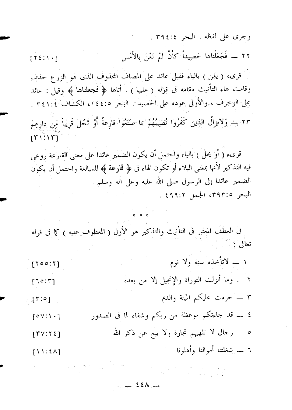 قرئ (يغن) بالياء فقيل عائد على المضاف المحذوف الذي هو الزرع حذف وقامت هاء التأنيث مقامه في قوله (عليها). أتاها {فجعلناها} وقيل: عائد على الزخرف، والأولى عوده على الحصيد. البحر 5: 144، الكشاف 4: 341.