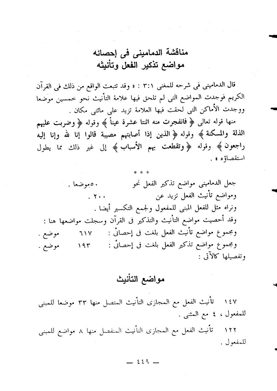 147 تأنيث الفعل مع المجازي التأنيث المتصل منها 33 موضعا للمبني للمفعول، 4 مع المثنى.