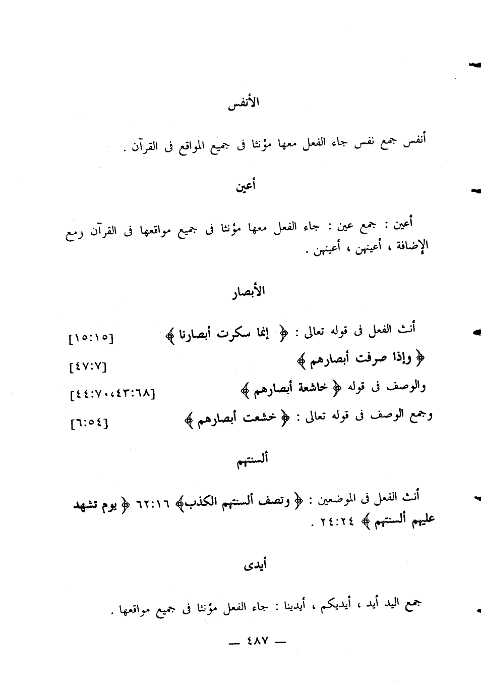 أعين: جمع عين: جاء الفعل معها مؤنثًا في جميع مواقعها في القرآن ومع الإضافة، أعينهن، أعينهن.