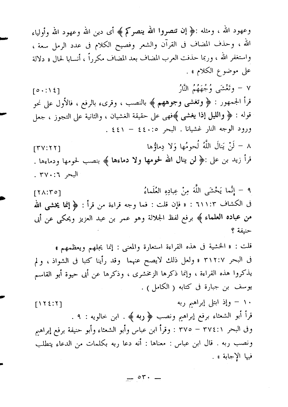 في البحر 7: 312: «ولعل ذلك لا يصح عنهما وقد رأينا كتبا في الشواذ، ولم يذكروا هذه القراءة، وإنما ذكرها الزمخشري، وذكرها عن أبي حيوة أبو القاسم يوسف بن جبارة في كتابه (الكامل)».