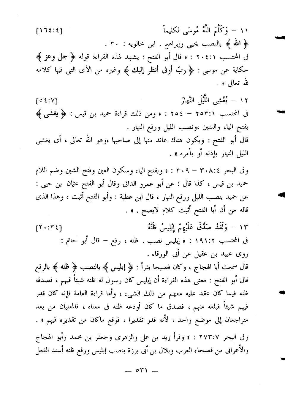 وفي البحر 4: 308 - 309: «وبفتح الياء وسكون العين وفتح الشين وضم اللام حميد بن قيس، كذا قال: عن أبو عمرو الداني وقال أبو الفتح عثمان بن حيي: عن حميد بنصب الليل ورفع النهار، قال ابن عطية: وأبو الفتح أثبت، وهذا الذي قاله من أن أبا الفتح أثبت كلام لا يصح».