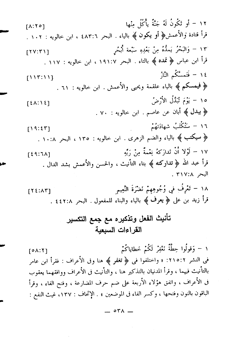 تأنيث الفعل وتذكيره مع جمع التكسير القراءات السبعية