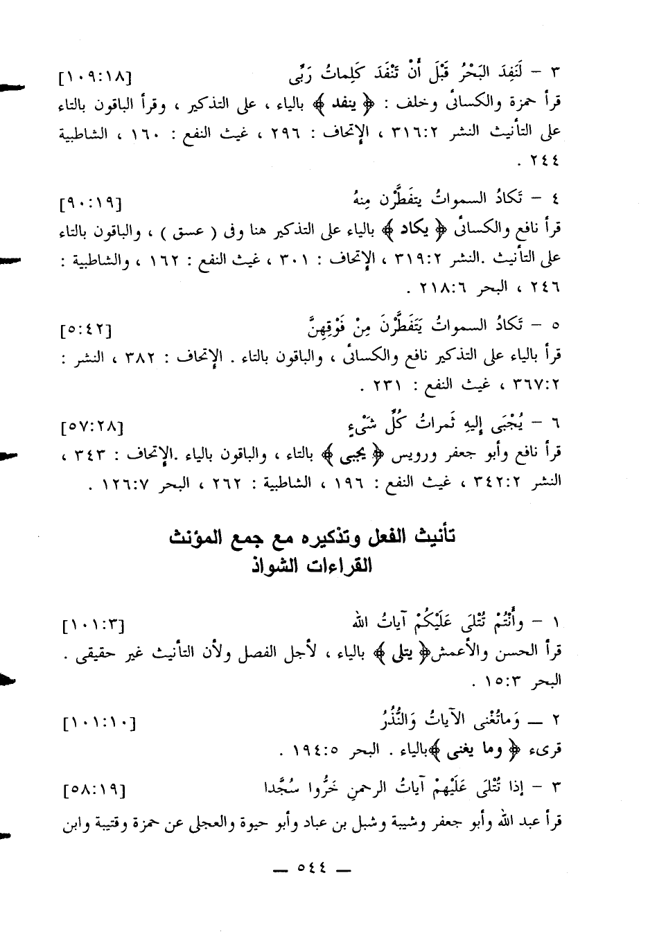 تأنيث الفعل وتذكيره مع جمع المؤنث القراءات الشواذ