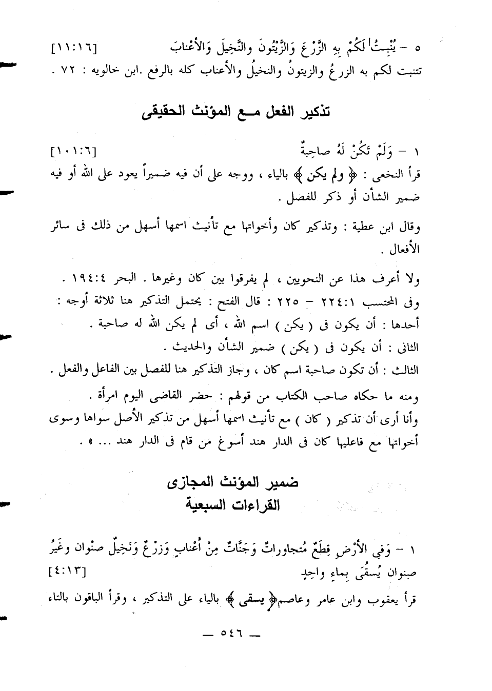وفي المحتسب 1: 224 - 225: قال الفتح: يحتمل التذكير هنا ثلاثة أوجه: