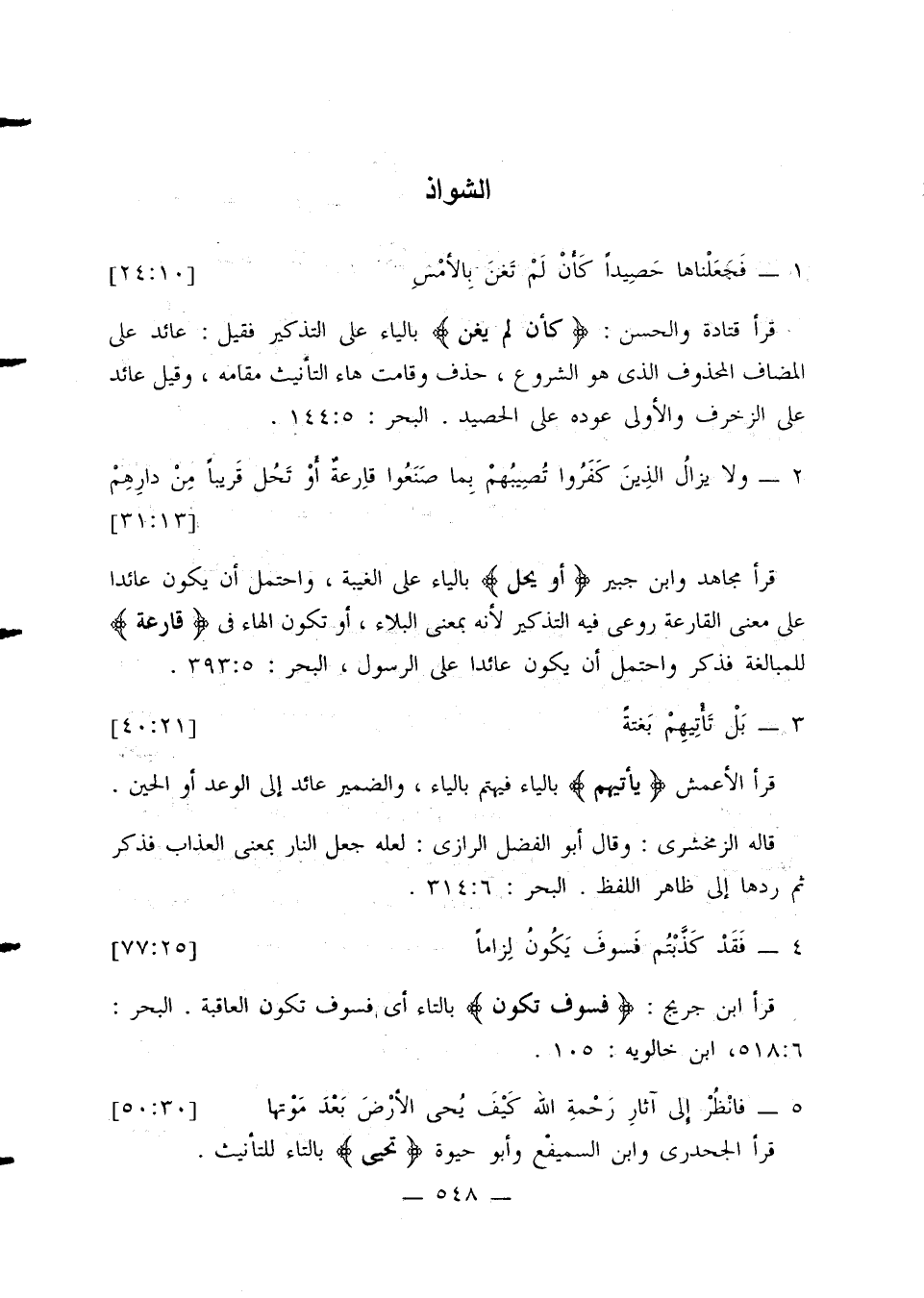 قرأ قتادة والحسن: {كأن لم يغن} بالياء على التذكير فقيل: عائد على المضاف المحذوف الذي هو الشروع، حذف وقامت هاء التأنيث مقامه، وقيل عائد على الزخرف والأولى عوده على الحصيد. البحر: 5: 144.