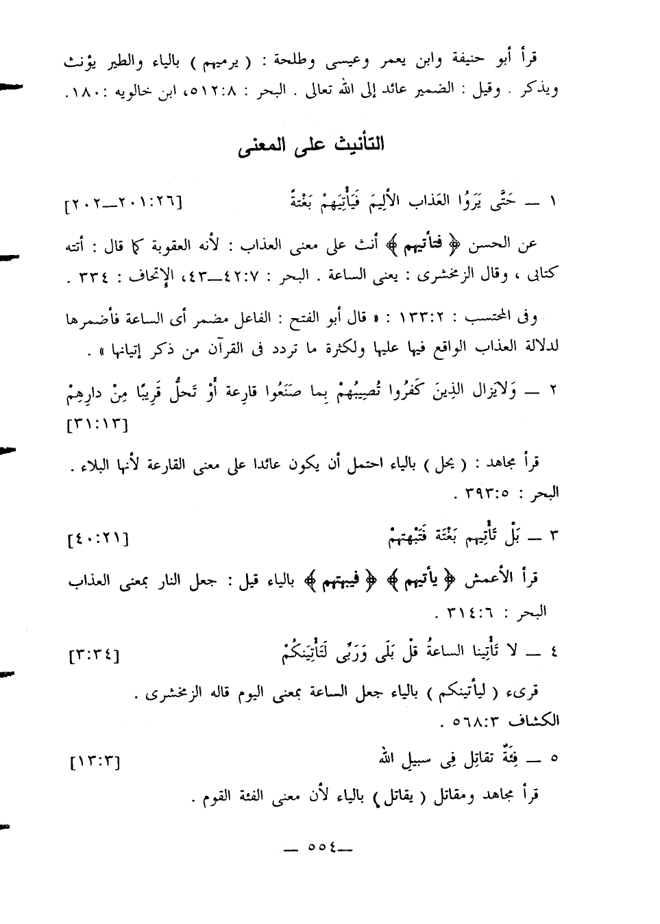 وفي المحتسب 2: 133: «قال أبو الفتح: الفاعل مضمر أي الساعة فأضمرها لدلالة العذاب الواقع فيها عليها ولكثرة ما تردد في القرآن من ذكر إتيانها».