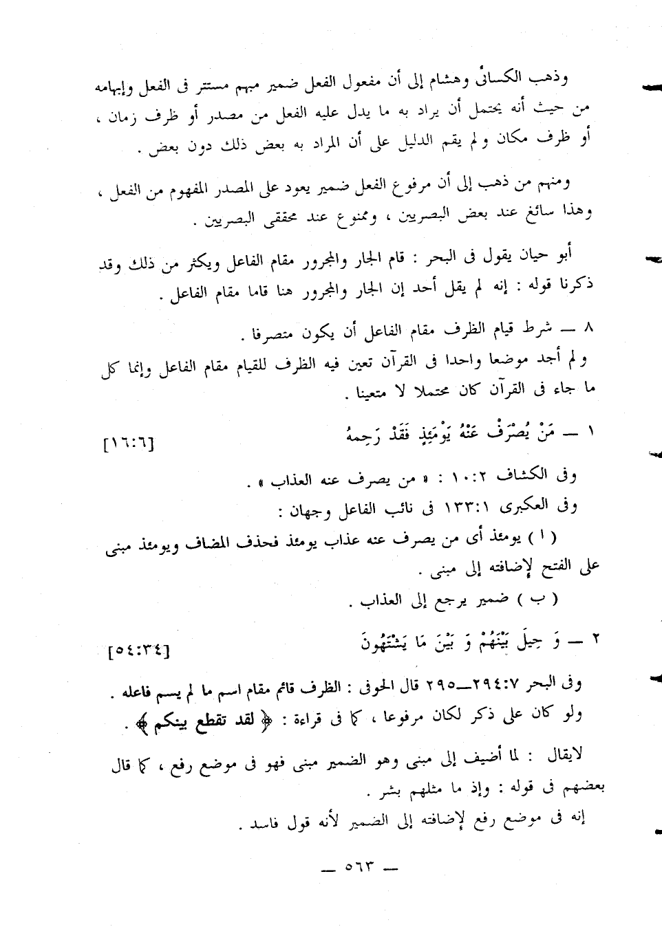 وفي البحر 7: 294 - 295 قال الحوفي: الظرف قائم مقام اسم ما لم يسم فاعله. ولو كان على ذكر لكان مرفوعًا، كما في قراءة: {لقد تقطع بينكم}.